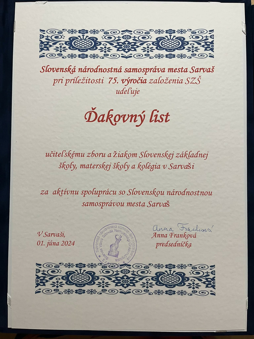 Frankó Anna, Szarvas Város Szlovák Nemzetiségi Önkormányzatának elnöke köszöntő emléklapot nyújtott át intézményünk igazgató asszonyának, valamint bejelentette, hogy idén is 200.000 Ft-tal támogatják diákjaink szlovákiai táboroztatását.