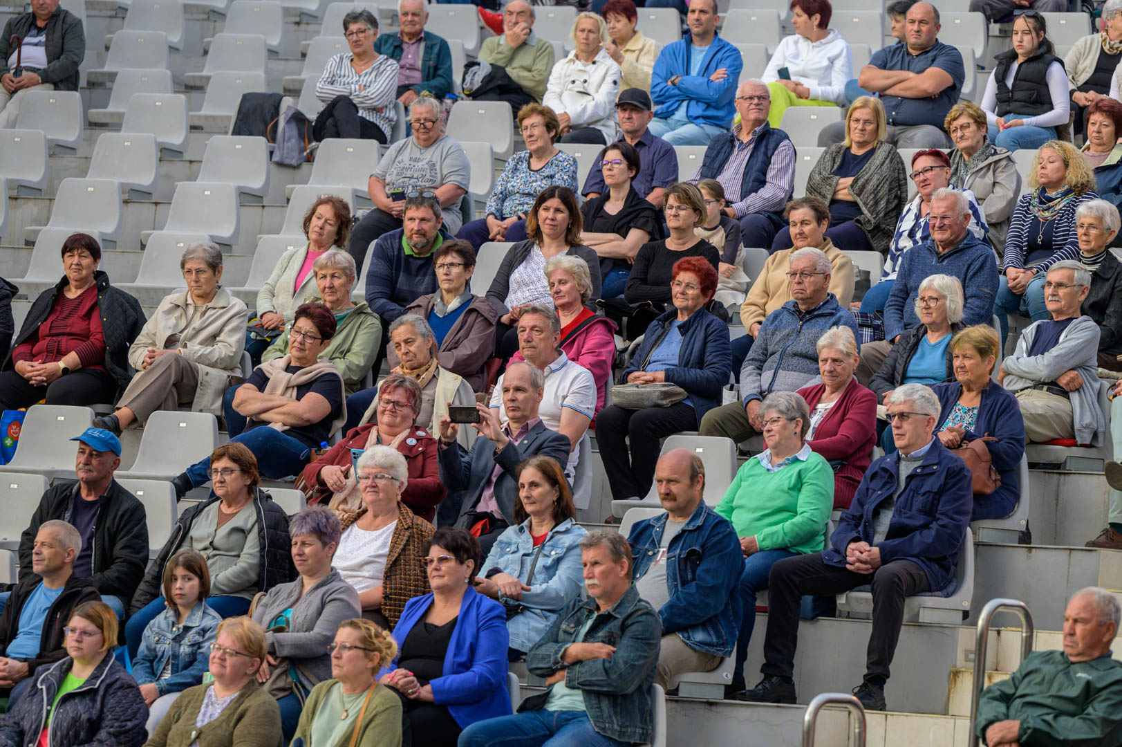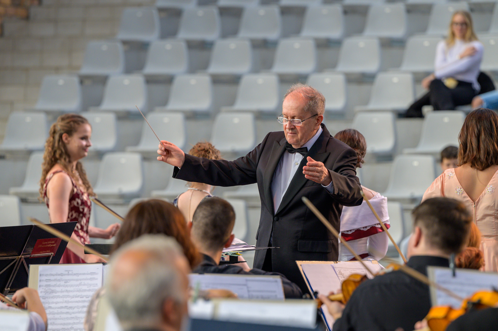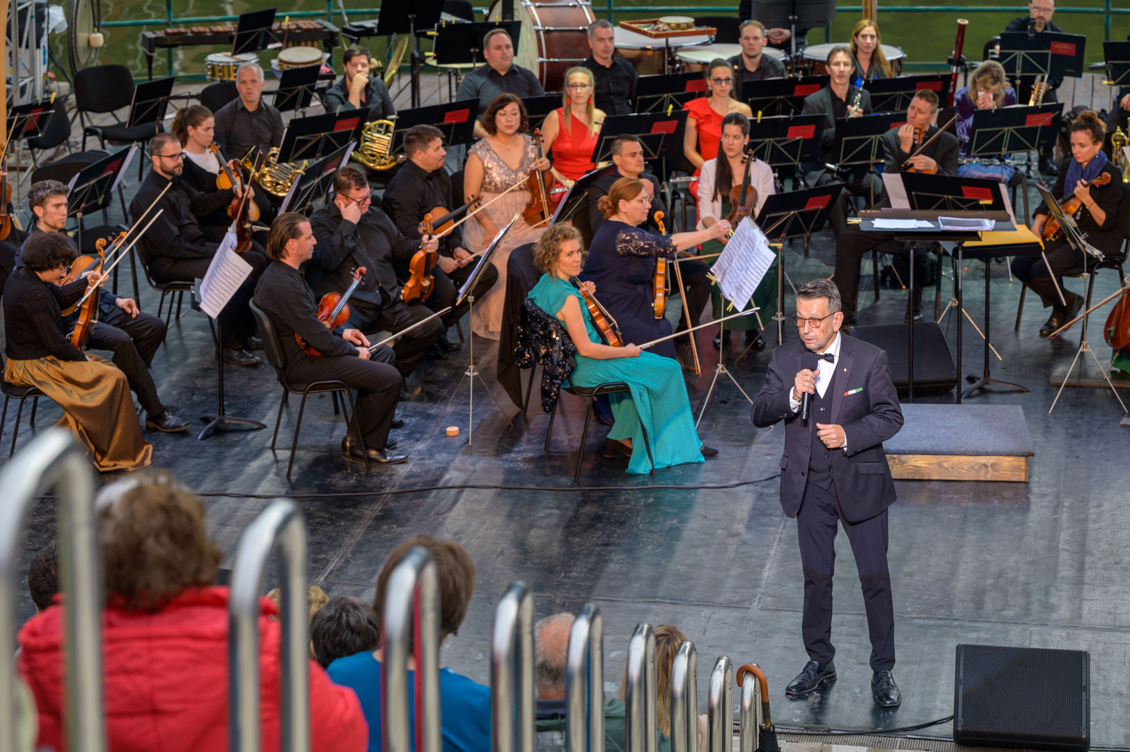Babák Mihály polgármester köszöntötte a zenekar tagjait, annak vezetőjét, Záborszky Kálmánt, valamint azokat a nézőket, akik az eső lógó lába ellenére eljöttek meghallgatni a filharmonikusokat.