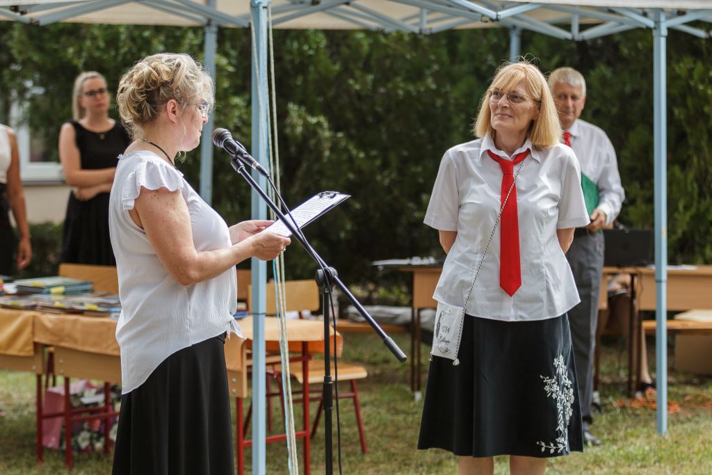 Az idei évben nem csak a végzős diákoktól köszöntünk el, ugyanis Pekárné Bakulya Tünde vállára is tarisznya került. Tünde néni 1985. szeptember 1-e óta dolgozik iskolánkban, viszont a következő tanévet már nyugdíjasként kezdi meg. A pedagógus pályájának lezárásaképp a Belügyminiszter Pedagógus Szolgálati Emlékéremben részesítette.