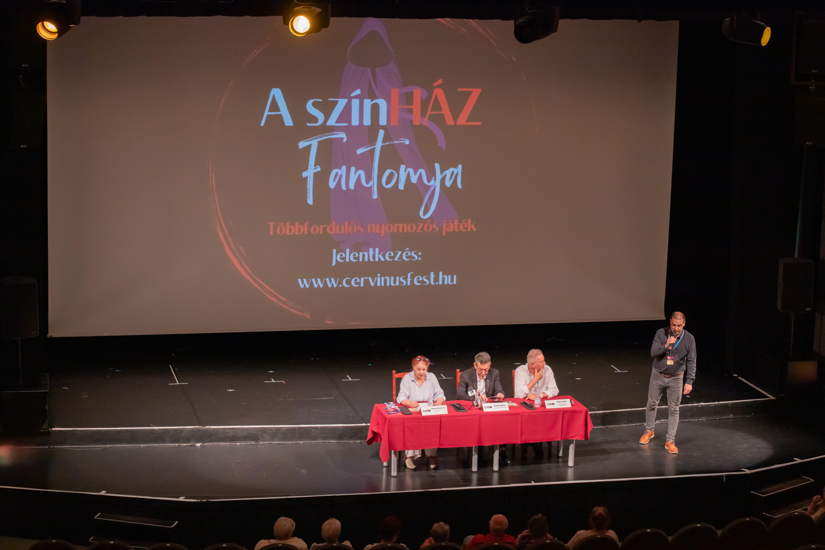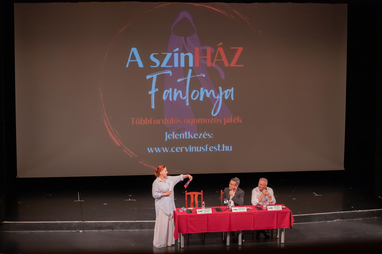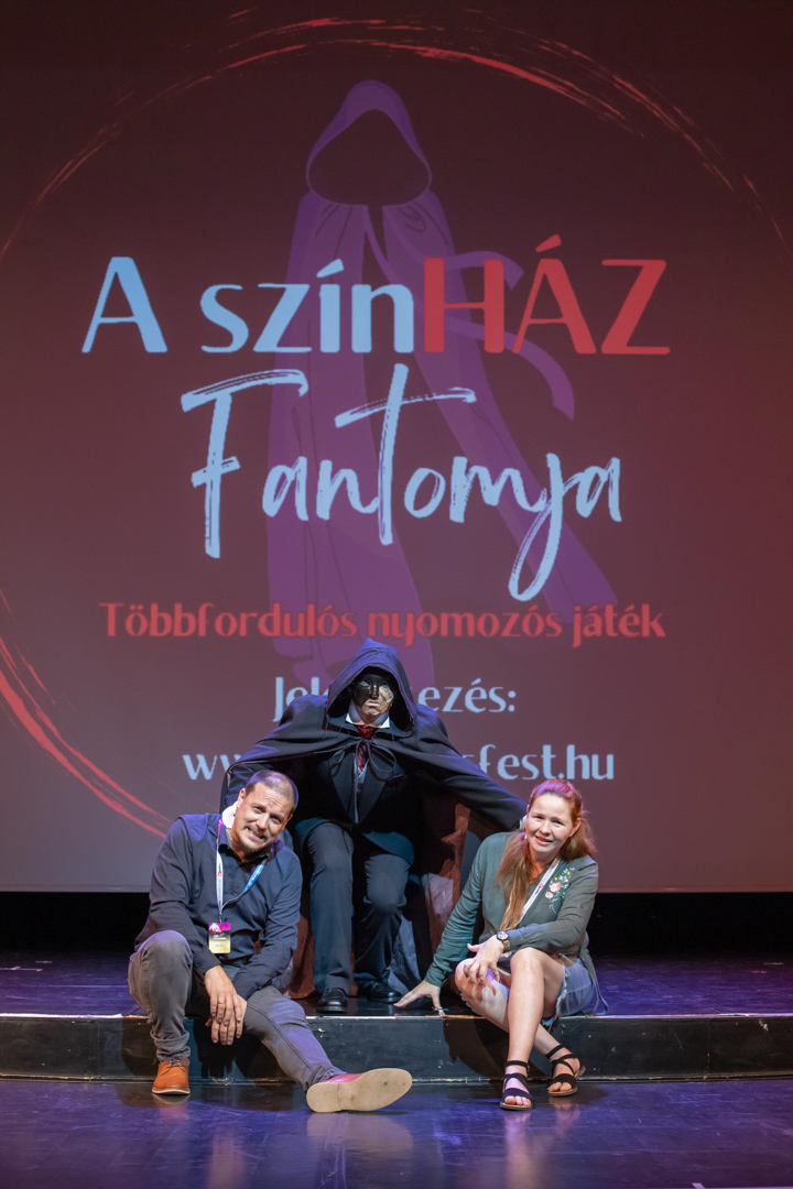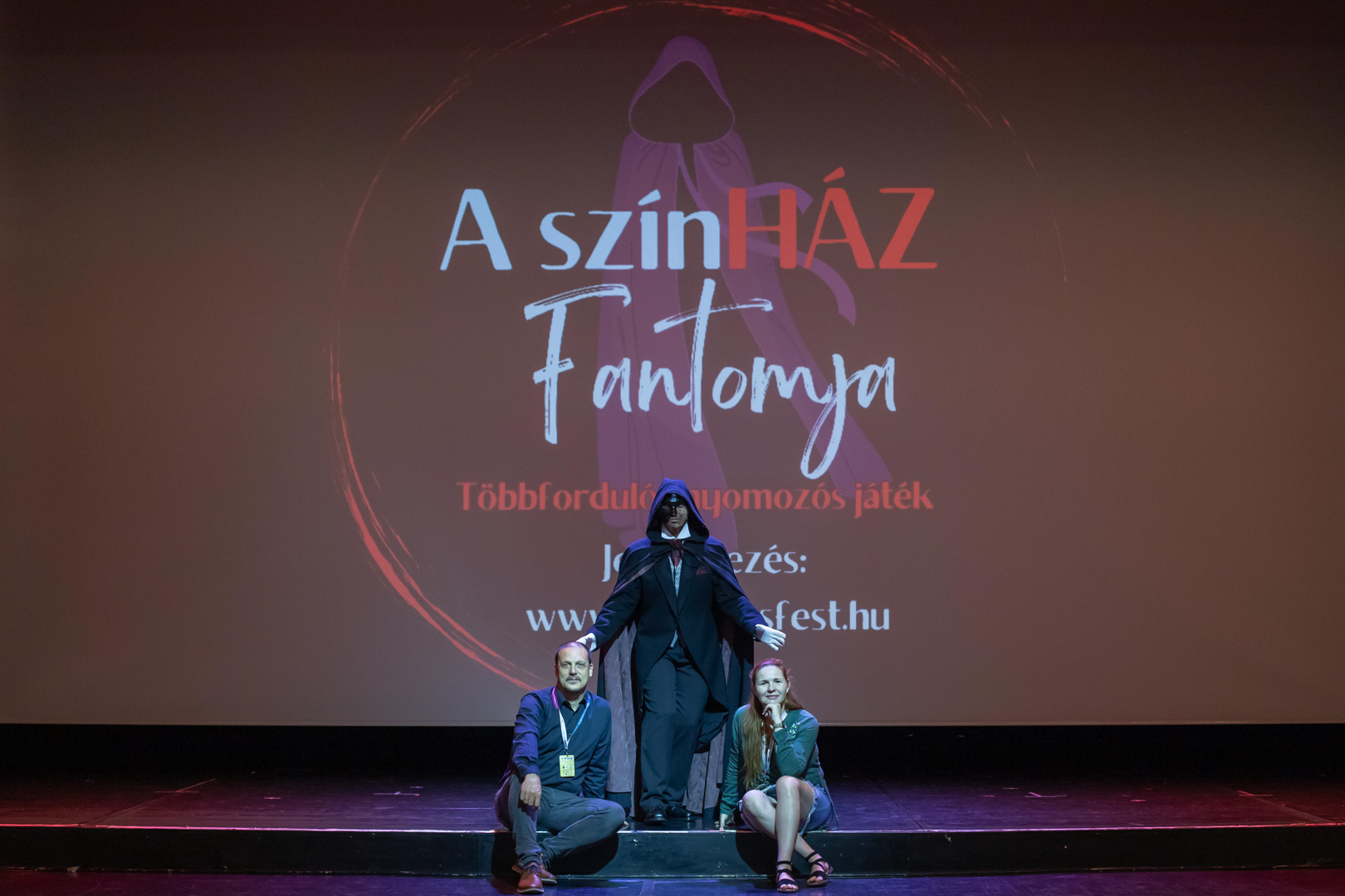 És igen, a FANTOM volt az, aki időnként átsuhant a színpadon, a nézőtéren. Erik a legújabb játékról mesélt, amire Dósa Zsuzsa kérte fel őket tavasszal, egy kimondottan színházi, nyomozós játékra. Ez egy hétfordulós játék, amelyre, már lehet jelentkezni a színház oldalán, vagy a színházban, de csak a CMF kezdőnapján július 11-én indul és szeptember 31-ig tart. Nem kell egy nap teljesíteni, de minden forduló után a megfejtést lezárt borítékban a színházba kell leadni, és ekkor kapják meg a következő feladatot.