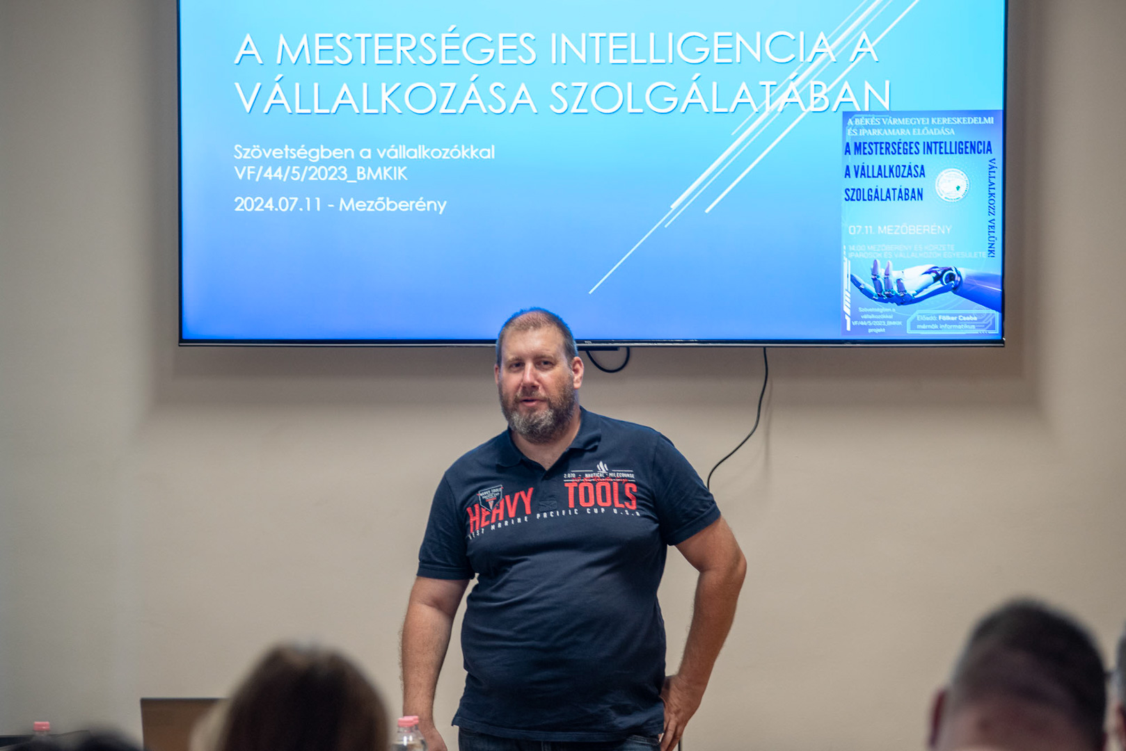 Hogyan jelent meg eddig mesterséges intelligencia és hogyan jelenhet és segíthet még a mesterséges intelligencia – erről tartott Mezőberényben, Mezőkovácsházán és Gyomaendrődön a Békés Vármegyei Kereskedelmi és Iparkamara szervezésében Fölker Csaba mérnök informatikus a napokban. Az előadás során betekintést nyerhetett a hallgatóság a mesterséges intelligencia alapjairól, arról, hogyan használható a marketingben, milyen, ingyenesen használható grafikai programokkal lehet látványos hirdetéseket készíteni, illetve, hogy mit nyújt a Trello program. Az utazást a Békés Vármegyei Kereskedelmi és Iparkamara, mint végső kedvezményezett a Nemzetgazdasági Minisztérium által támogatott Vállalkozásfejlesztési Projekt (VF44/5/2023) keretében valósította meg.