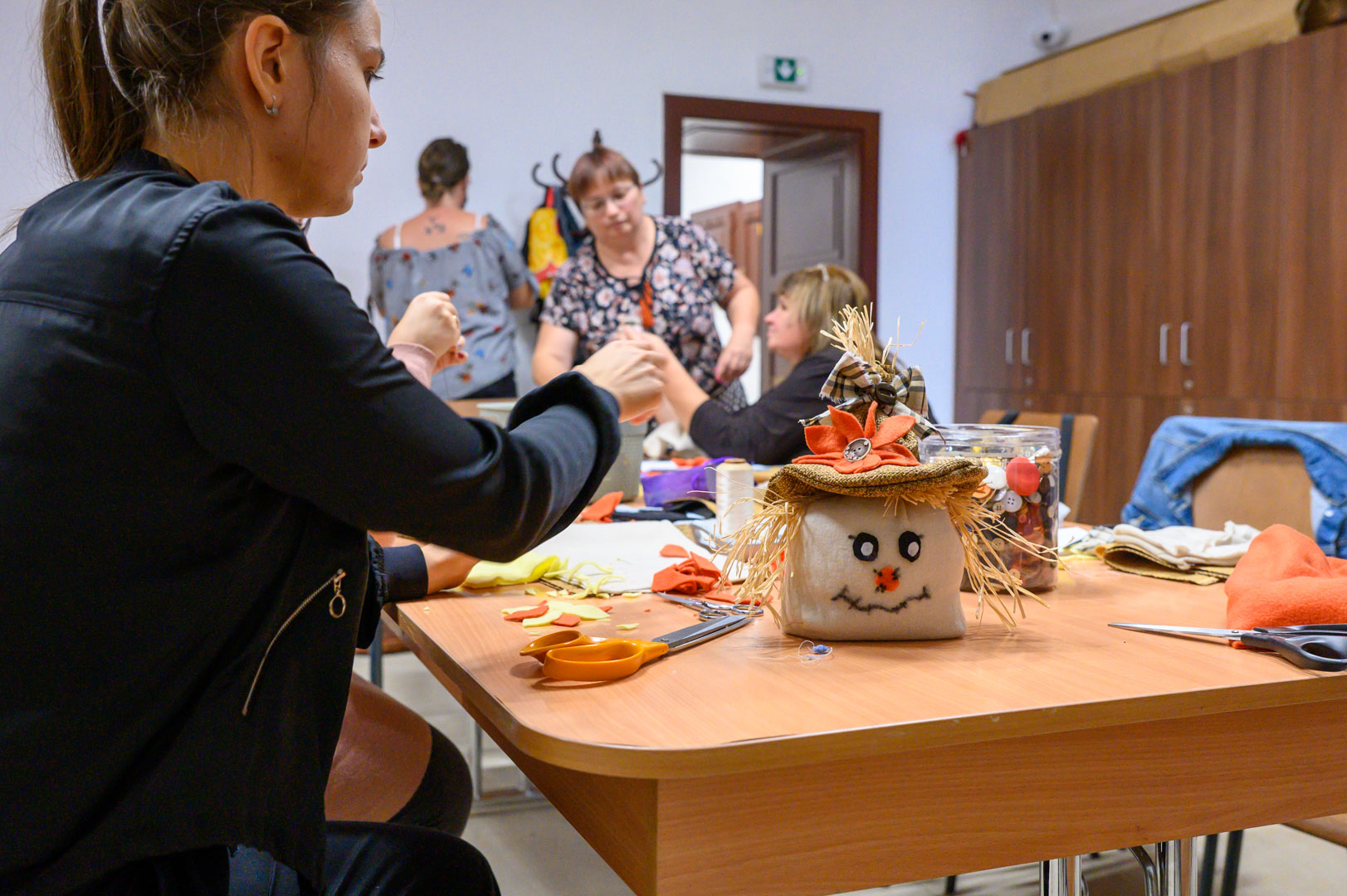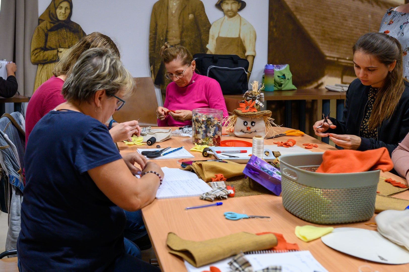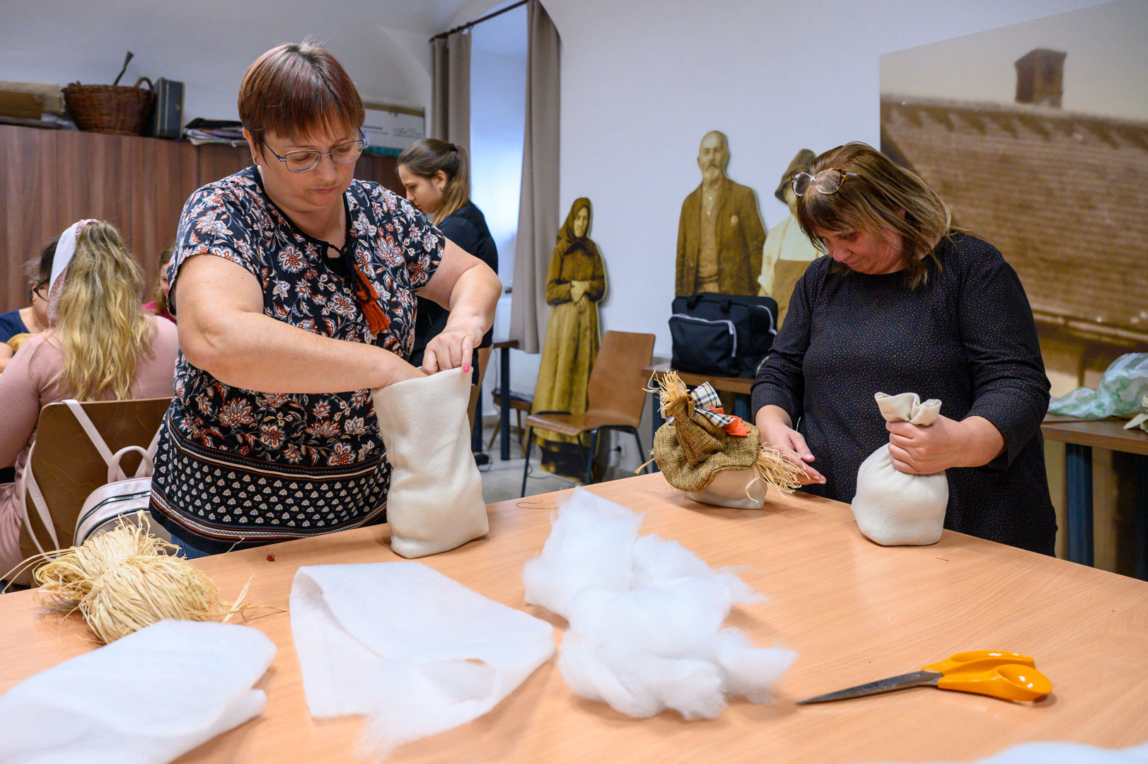 Szeptember harmadik szombatjának témája egy őszi asztaldísz, egy madárijesztő elkészítése volt. A résztvevők már túl voltak az íves formák szabásán, és a figura törzsének, egyben fejének összeállításánál jártak. Ezt megtöltötték sóderrel, illetve vatelinnel. A foglalkozás hátralevő részének feladata volt a kalap összeállítása, illetve a díszítés gombokkal, színes textildarabokkal.