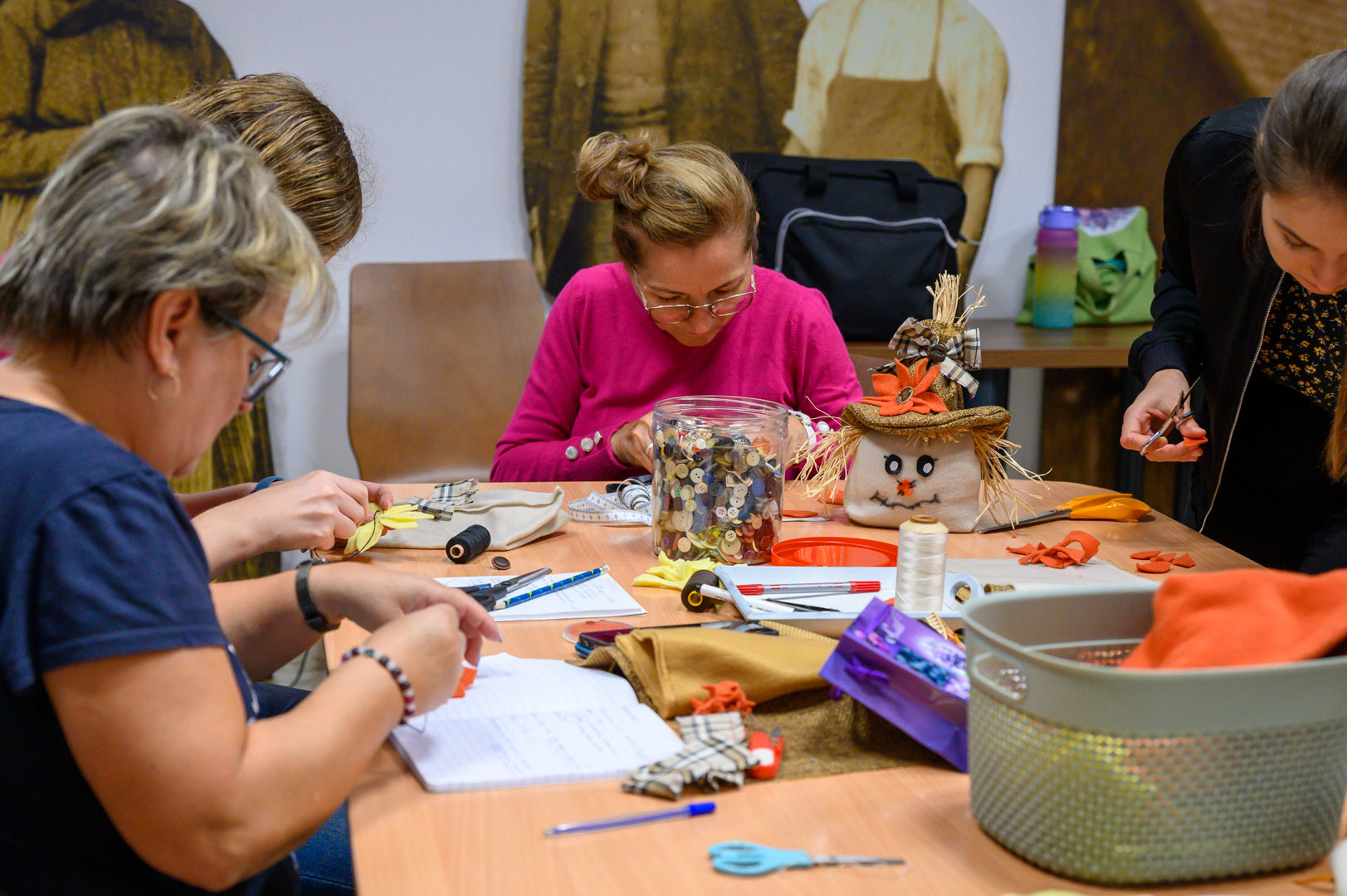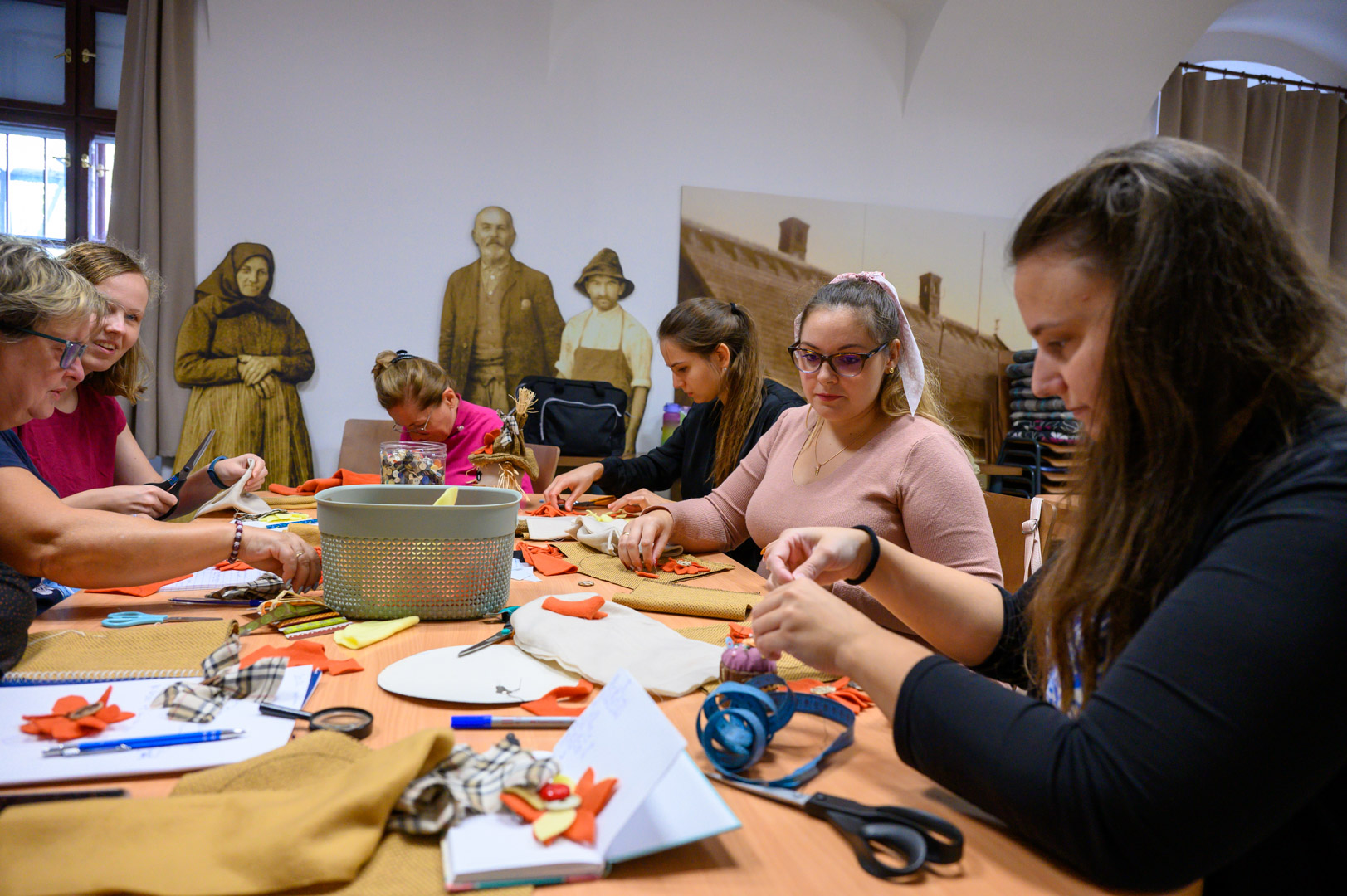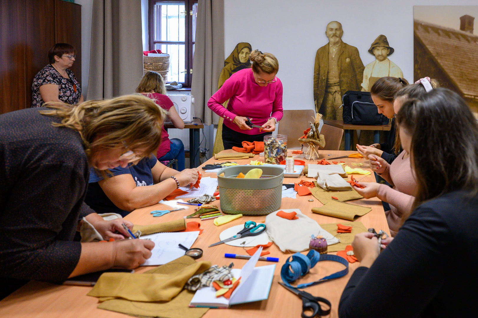 Szeptember harmadik szombatjának témája egy őszi asztaldísz, egy madárijesztő elkészítése volt. A résztvevők már túl voltak az íves formák szabásán, és a figura törzsének, egyben fejének összeállításánál jártak. Ezt megtöltötték sóderrel, illetve vatelinnel. A foglalkozás hátralevő részének feladata volt a kalap összeállítása, illetve a díszítés gombokkal, színes textildarabokkal.