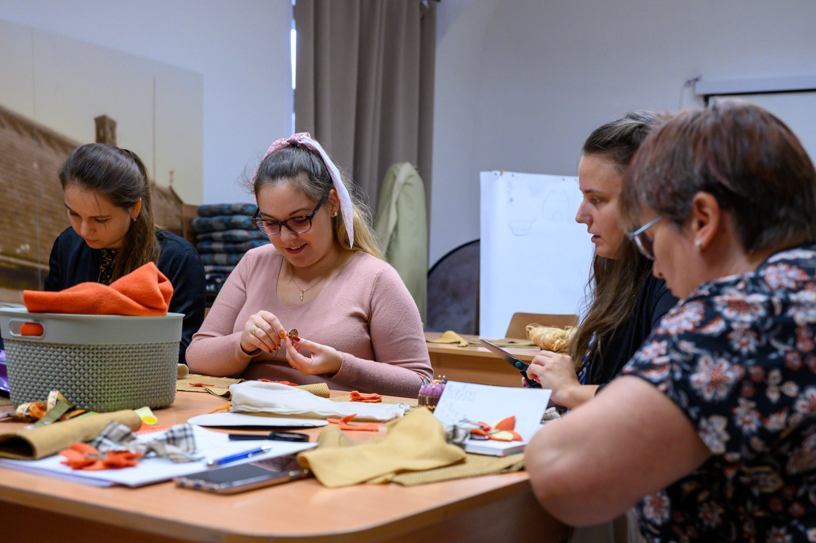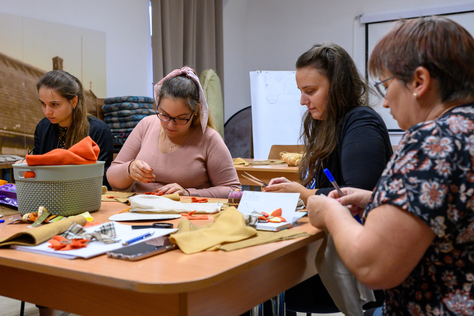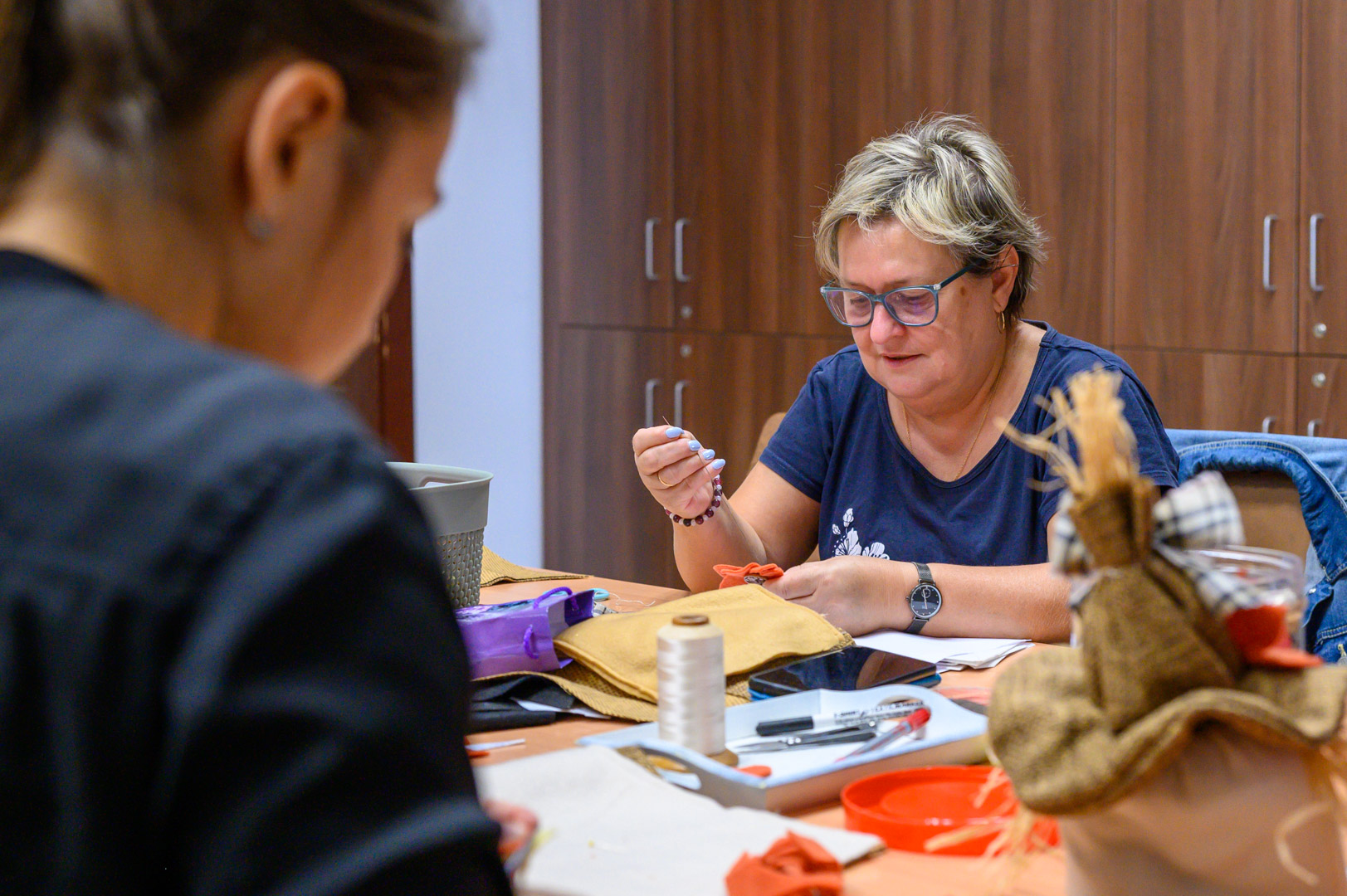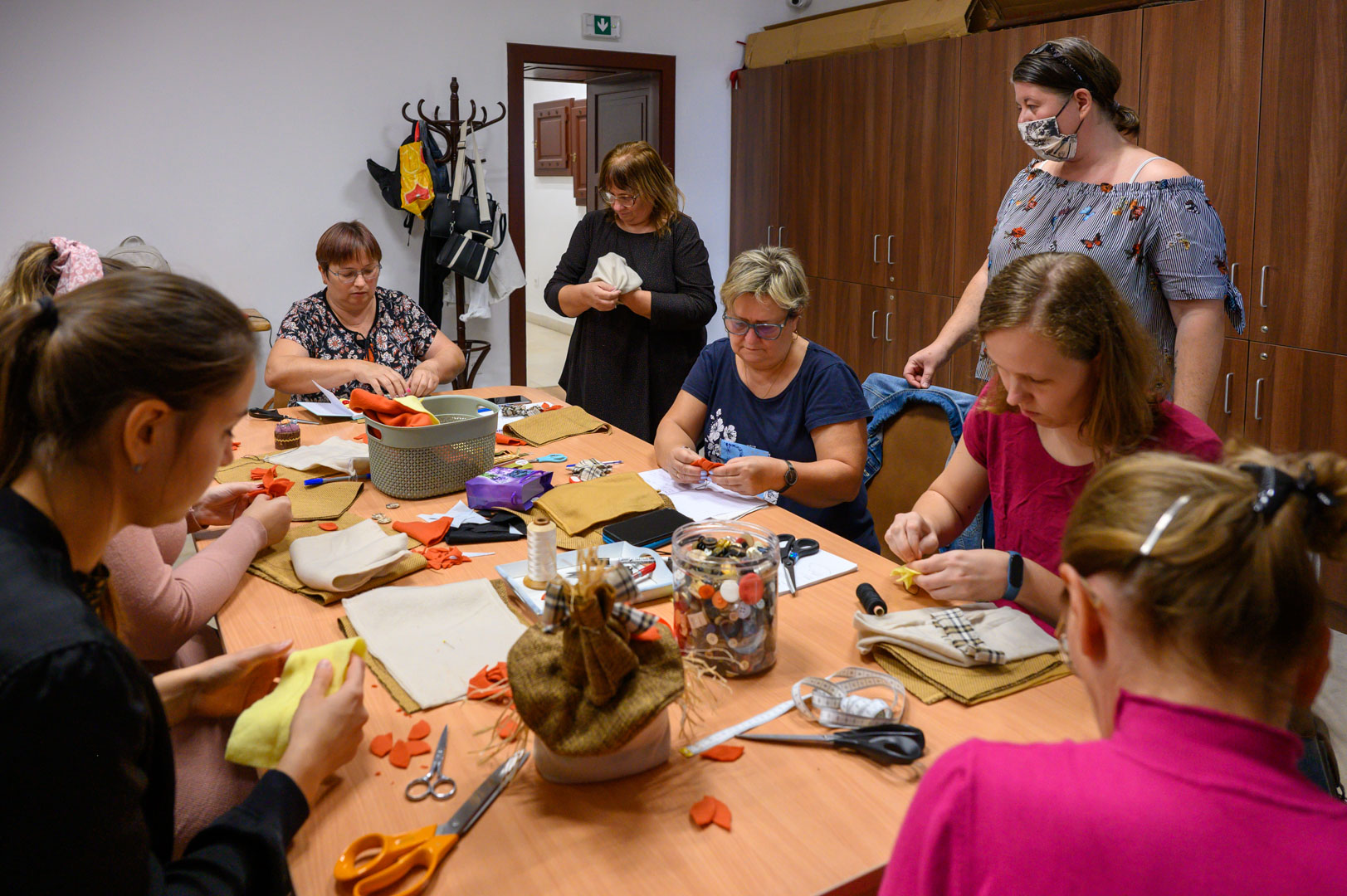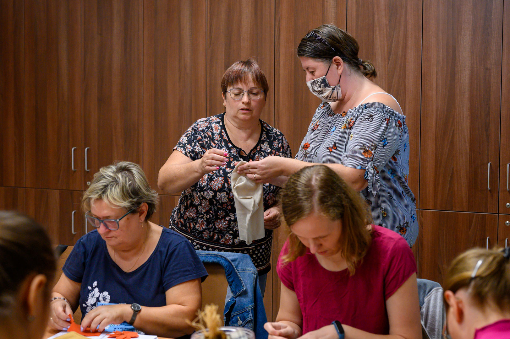 A foglalkozását tekintve óvónő, de varrónői végzettséget is magáénak tudó Kisné Szalai Edina által instruált sorozat mai foglalkozásán a résztvevők megismerkedhettek a különböző anyagok kezelhetőségével, jellegzetességeivel. Ezeken a kora délutánba hajló délelőttökön sok visszatérő elem van, a változatosságot mindig a feladatok mássága adja, fogalmazott a szakkörvezető. Elmondása szerint ez a “törzsgárdistákat” sem riasztja el, számukra ezek az ismétlések hozzájárulnak a sikerélményhez.