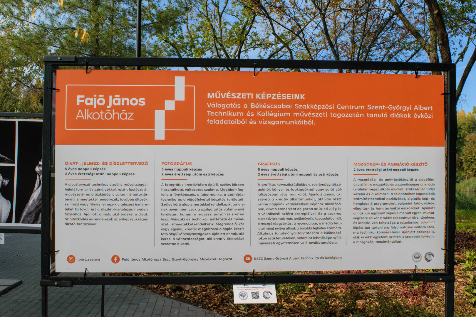 Novák Attila arról szólt, hogy óvodásként és kisiskolásként a többség rajzban még jobban kifejezi magát, mint szóban, ami azután persze megváltozik, de mégis a rajz egy olyan kifejezési forma, olyan dimenzió, amit sokan szeretnek és sokan művelnek is. Iskolájukban, a Fajó János Alkotóházban divattervező, grafikus, fotós képzéssel várják az általános iskola végzőseit, de érettségi utáni képzésre és esti tagozatra is várják a jelentkezőket a fentieken túl animációs képzéssel. A leporelló-kiállítással gyorsan, egyszerűen, vizuálisan kívánták bemutatni képzéseik eredményét. Nagyrészt vizsgamunkákat láthat a közönség, s a leporellók alatt található QR-kóddal eljuthatnak a Fajó János Alkotóház Facebook-oldalára, ahol további érdekességekkel találkozhatnak.