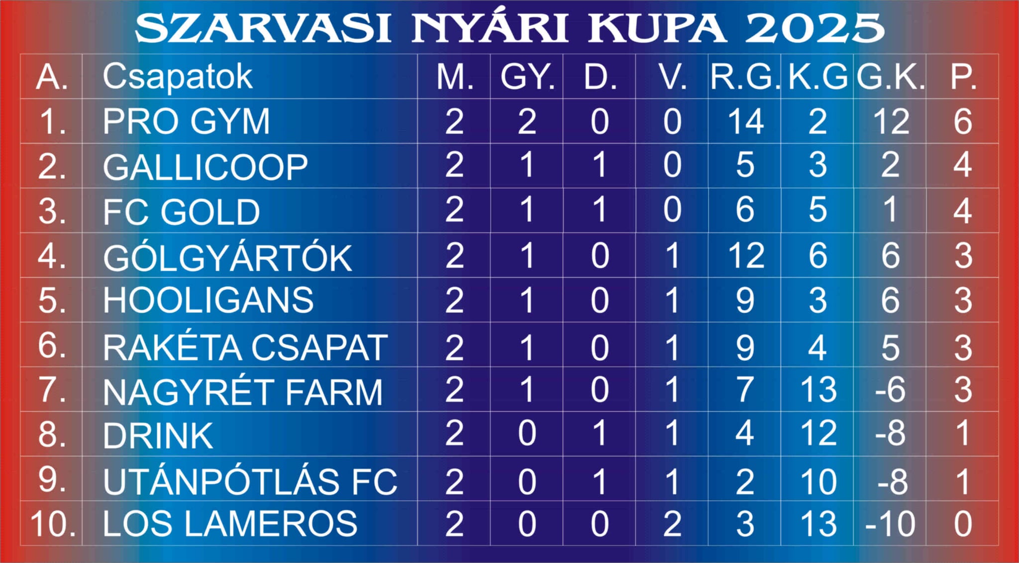 Góllövőlista: 3: Bagi(Hooligans), Egri(Rakéta Csapat), Bencsik P.(FC Gold), Styecz(Gólgyártók), Viszkok, Kajtár(Pro Gym)