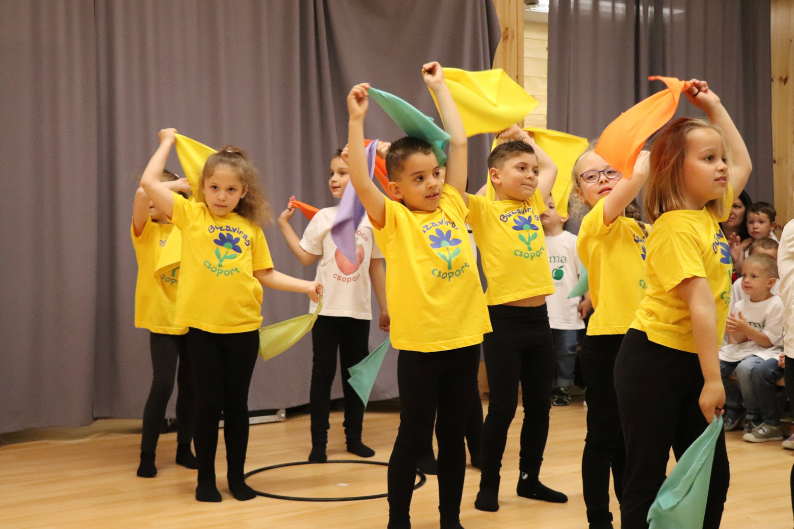 A nagycsoportosok egy vidám, lendületes tánccal kedveskedtek szüleiknek és társaiknak. A színes kendők libbenése üdítő látványt nyújtott, méltó zárása volt az óvodai éveknek. Az ünnepség végén a gyerekek a kendőkkel integetve, virágokkal díszített kapu alatt vonultak át jelképesen az iskolába, ahol már izgatottan várták őket a leendő tanító nénik.
