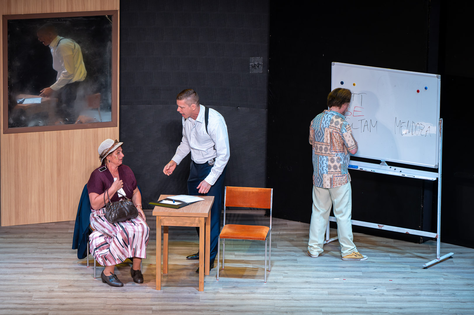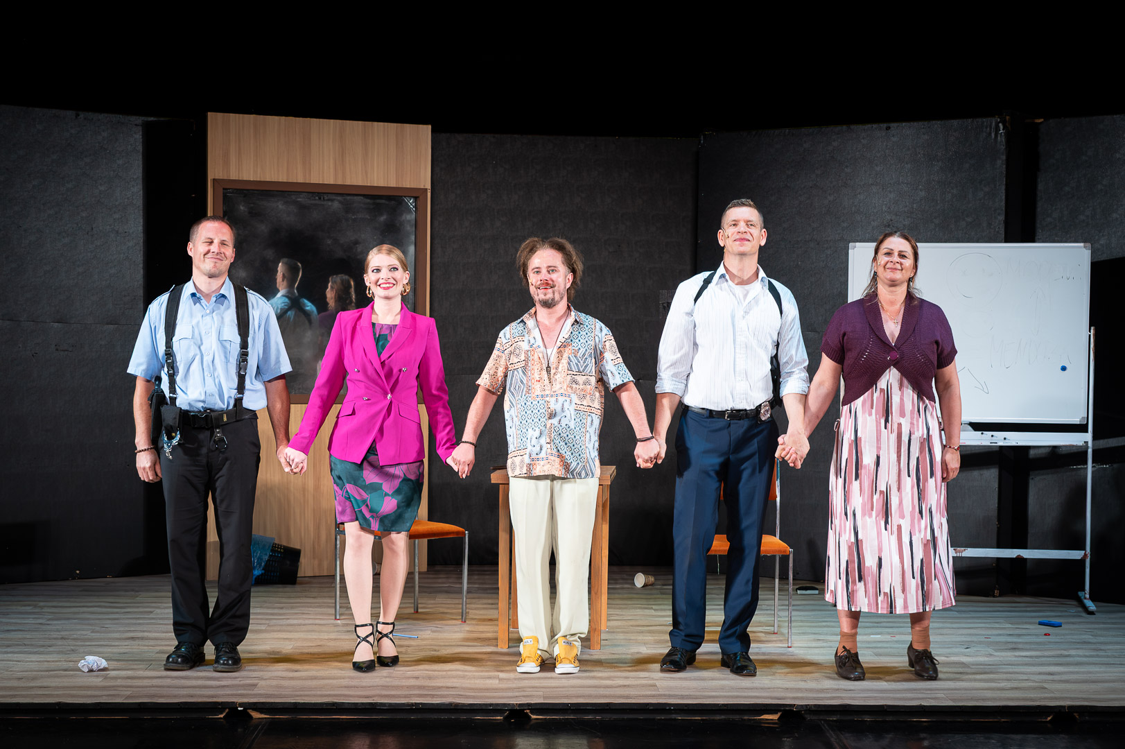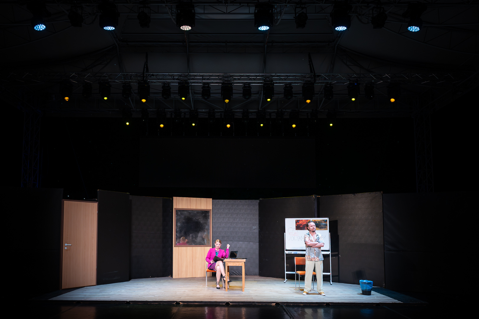 Ez a bemutató a Cervinus kisszínpadán, a kamarateremben került bemutatásra, de pénteken este a Vízi Színház hatalmas színpadán is ugyanolyan feszült előadást láttunk.