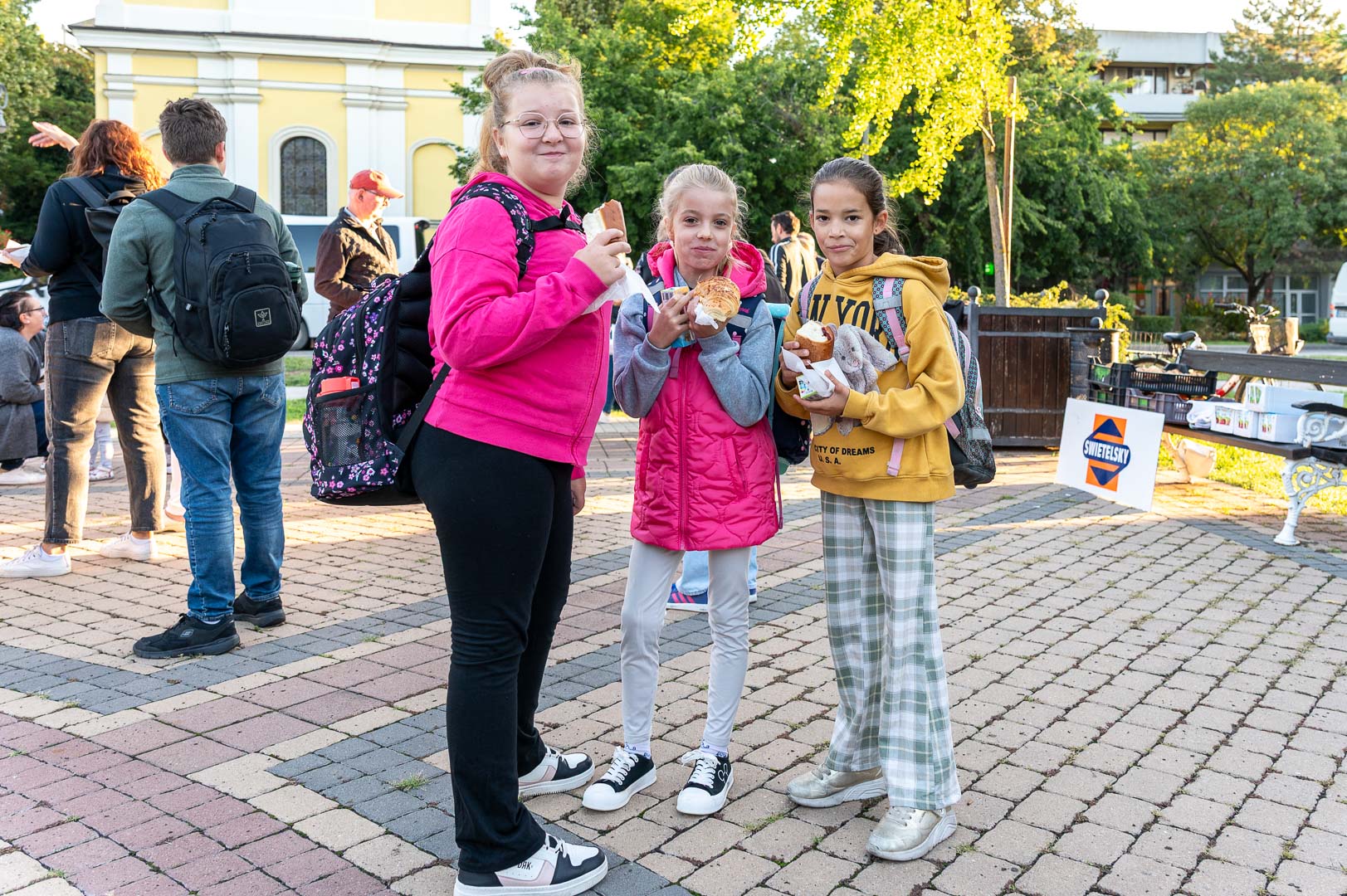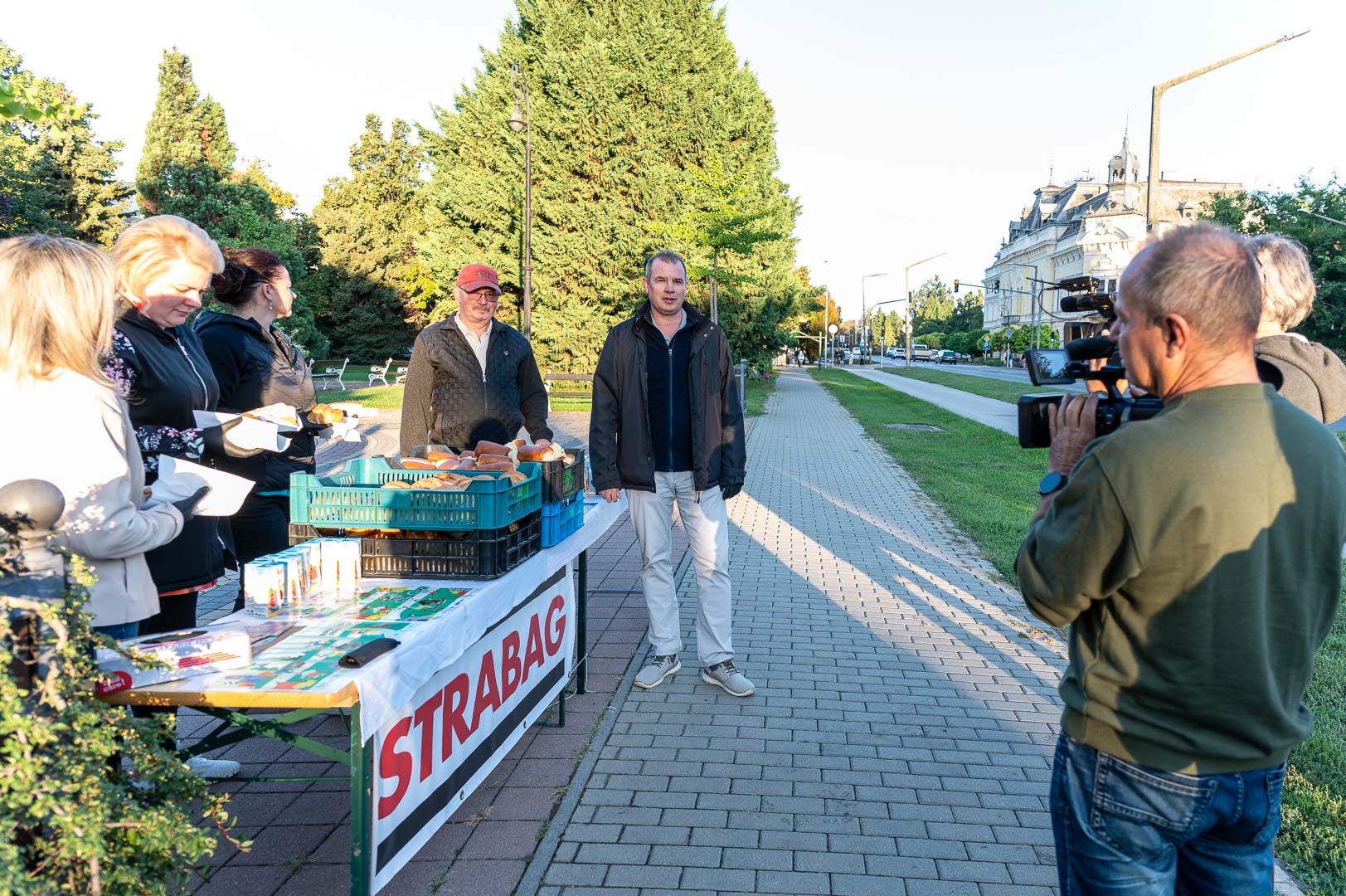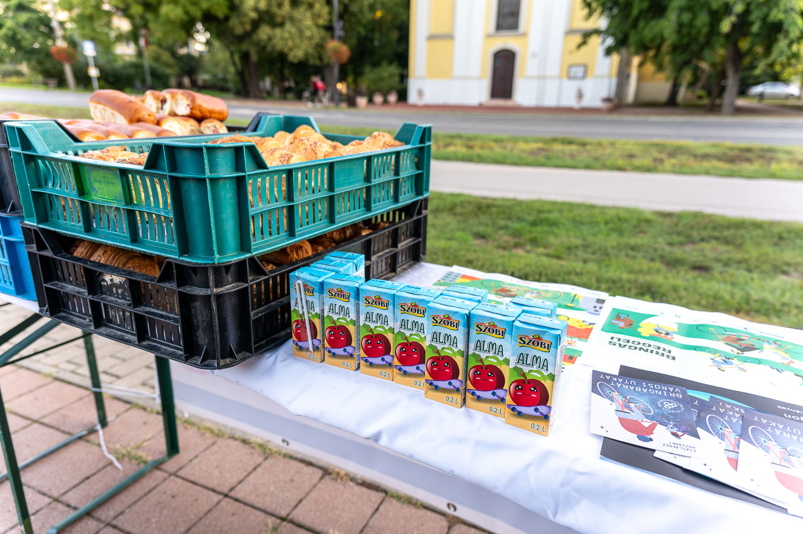 A mai reggelit Hodálik Pál polgármester nyitotta, majd munkatársai segítségével szétosztotta azokat a pékárukat, illetve gyümölcsleveket, amiket a Strabag és a Swietelsky cégek támogatásával szereztek be.
