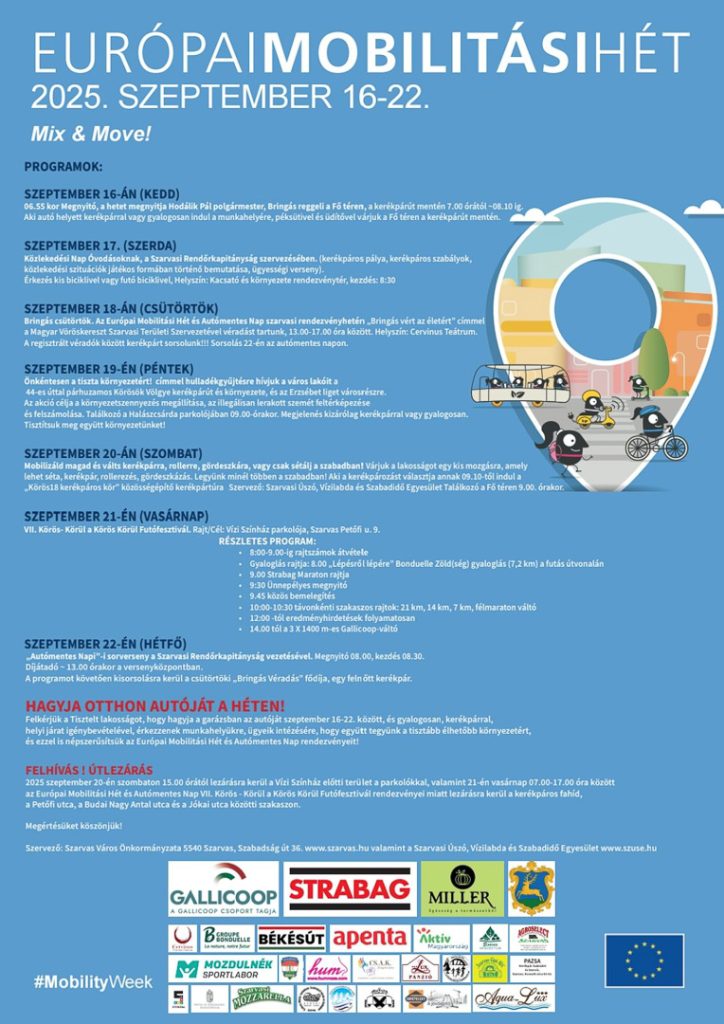 Bringás reggelivel indult a 2025-ös Európai Mobilitási Hét és Autómentes Nap programsorozata Szarvason ma reggel, aminek folytatásaképp egész héten változatos eseményekkel népszerűsítik az autómentes, környezettudatos közlekedési formákat, valamint a közösségi aktivitásokat. Minden napra jut egy meghatározott program, amely kiemelt figyelmet fordít a gyalogos, kerékpáros és alternatív közlekedési módokra, illetve a környezetvédelemre: