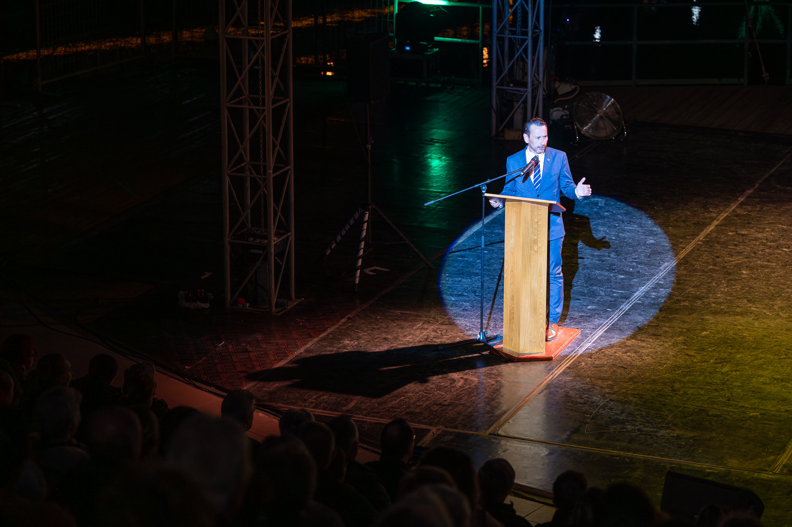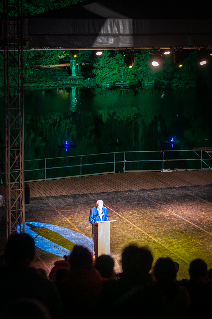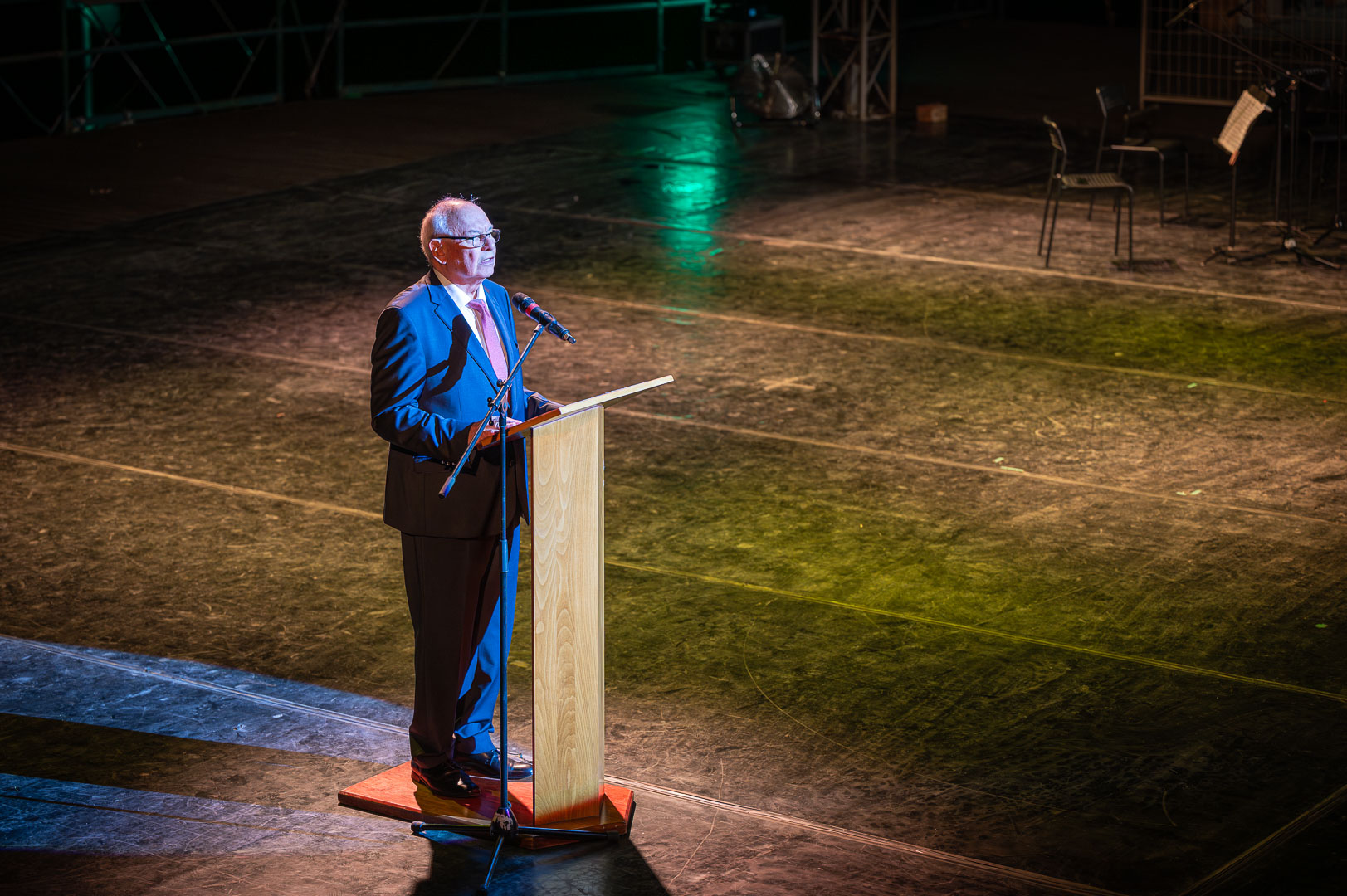 A közönséget Pártai Lucia köszöntötte, illetve tájékoztatta az este történéseiről. Elsőként Szarvas Város Barátainak Köre elnökét, Bődi Jánost, Szarvas város díszpolgárát kérte fel, köszöntse a nézőtéren ülőket. Az INTEGRÁL Építő Zrt. nyugalmazott vezérigazgatója többszörösen illetékes volt az első szóló jogára: ő volt a fő mozgatórugója, illetve az általa vezetett egyesület, valamint építőipari cége volt a Napkorongos Csodaszarvas szobor állításának fő támogatója.