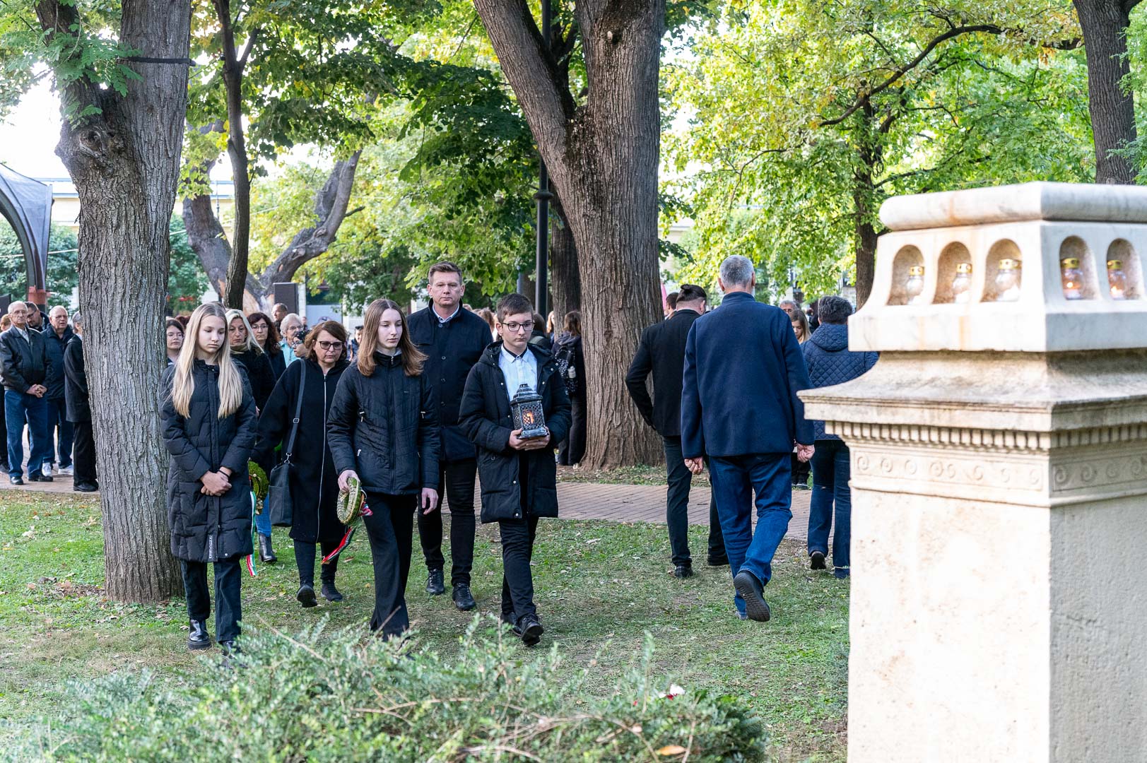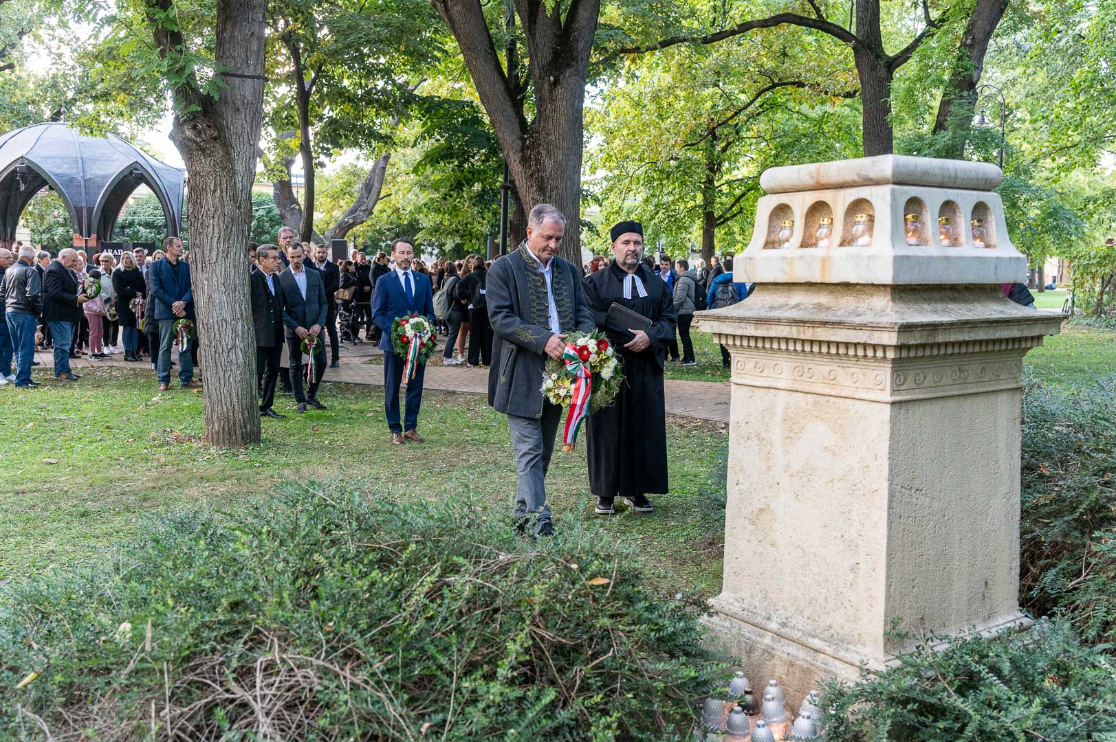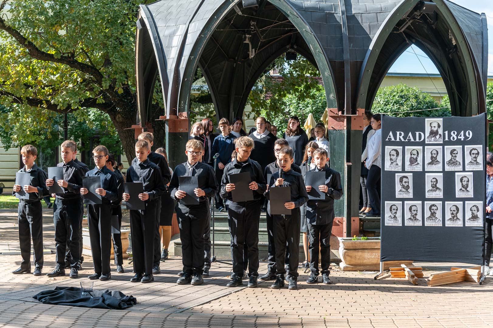 Az emlékezőket dr. Bartolák Csaba alpolgármester köszöntötte. szabadságra, hűségre és hazaszeretetre emlékezett, s elmondta, hogy az aradi tizenhárom irányt mutatott akkor is, amikor nehezebb idők járták és irányt mutat akkor is, amikor könnyebbek. Példájuk emlékeztet arra is – mondta az alpolgármester –, hogy a szabadság nem magától értetődő, s a fiataloknak el kell mesélni azoknak a történetét, akik életüket áldozták a magyar szabadságért. Ezt – a történet elmesélését – idén is a Benka Gyula Evangélikus Általános Iskola diákjai tették meg. A versekkel, prózával és énekkel körített műsorban egyedi koreográfiával ábrázolták a tábornokok és az első felelős magyar kormány miniszterelnökének tragikus sorsát: előbb fakereszteket helyeztek el a portrékat ábrázoló tablónál, majd egy-egy fekete lappal letakarták az arcképeket. Megemlékező beszédében Dankó Béla országgyűlési képviselő is a gyásznap kettősségére hívta fel a figyelmet, az egyik legfájdalmasabb ugyanakkor az egyik legfelemelőbb emléknapnak nevezve október 6-át. A tábornokok soknemzetiségére utalva mondta el, hogy a különbözőségeket felülírta a haza ügye, s a kivégzésekkel, megtorlásokkal a hatalom meg akarta félemlíteni a nemzetet, de épp az ellenkezőjét érte el. Azzal a kérdéssel is szembesítette a szónok hallgatóságát, hogy vajon méltók vagyunk-e a szabadságharcos mártírok örökségére, felelősen vigyázunk-e a hazára? – Hiszem, hogy igen – válaszolta meg a kérdést Dankó Béla –, hogy olyan jövőt formálunk, ami méltó az aradi tizenháromhoz, a nemzethez. A mécsesgyújtás és koszorúzás előtt Lázár Zsolt evangélikus esperes könyörgő imájával kérte az Úr áldását az aradi tizenháromra és a rájuk emlékezőkre.