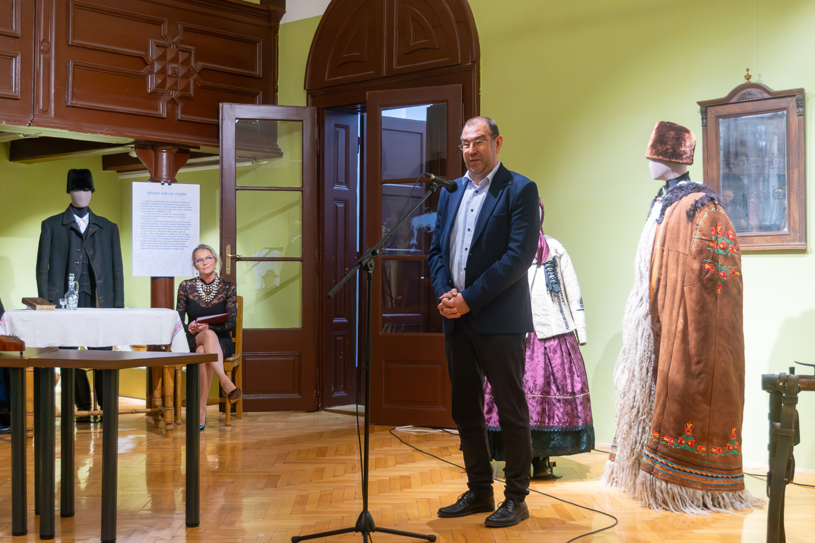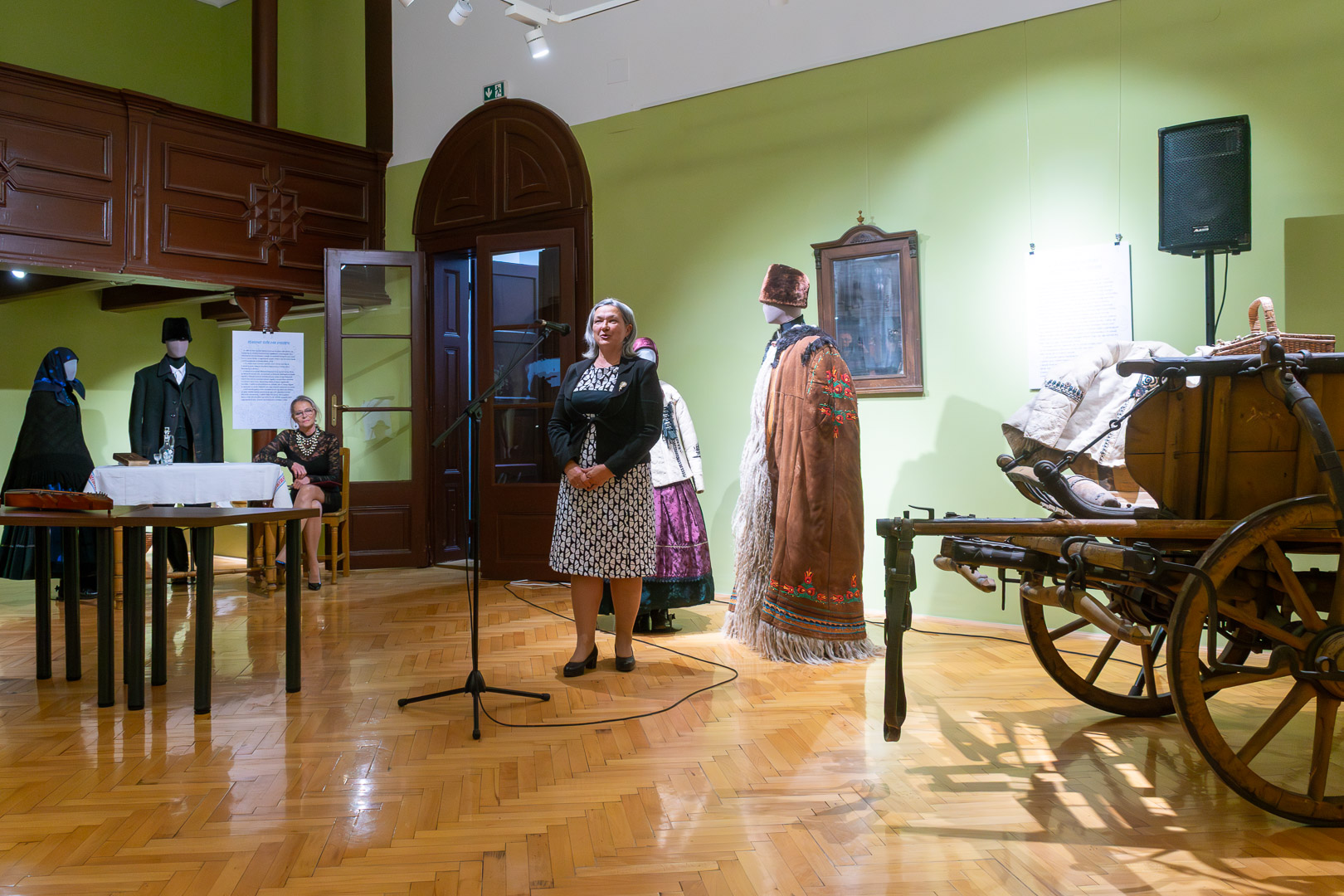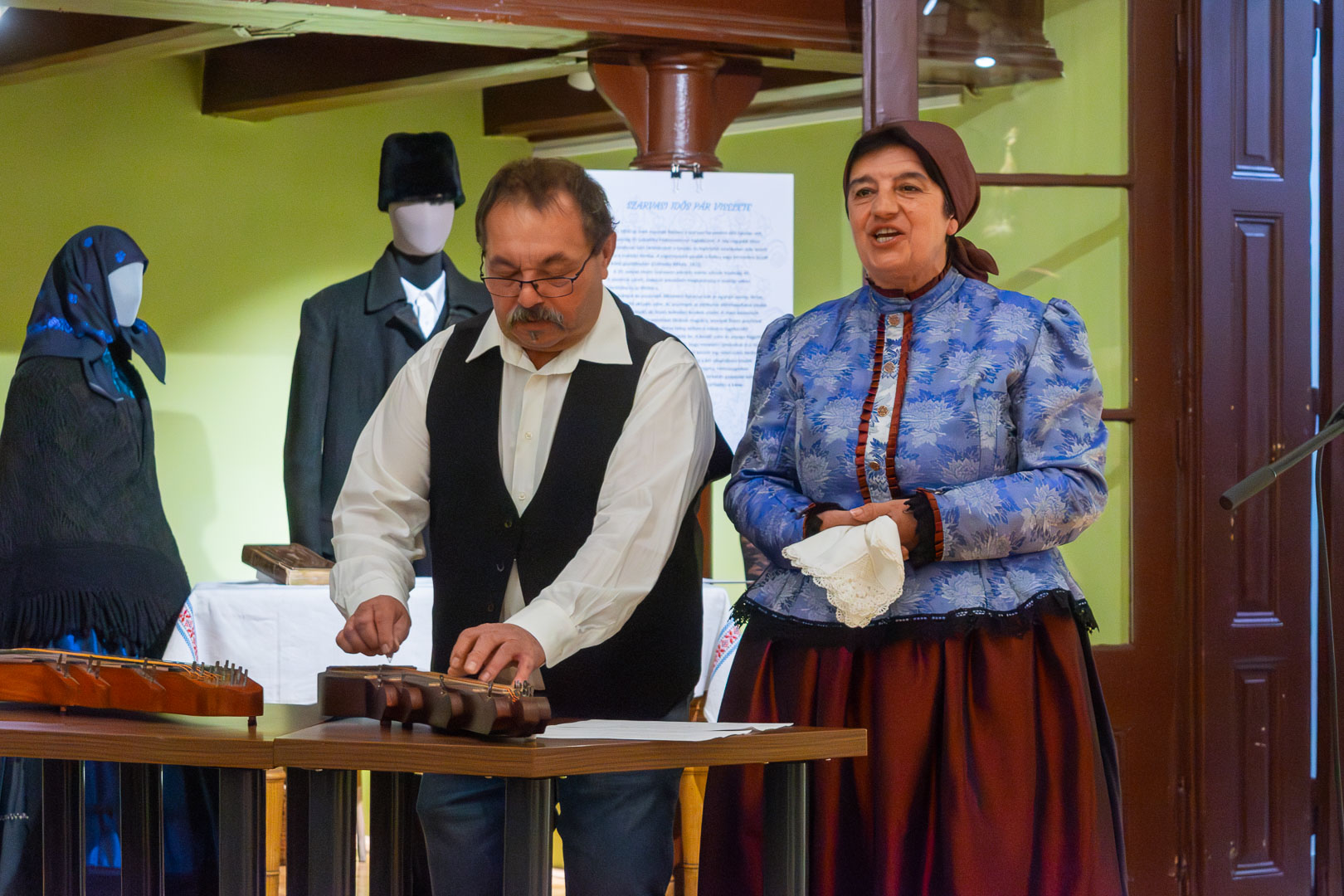 Csasztvanné Vass Edit – szintén citerával kísért – népdalcsokra után dr. Filus Erika beszélt a kiállítás értelméről és jelentőségéről, ami nem más, mint hogy a kiállított bábuk úgy néznek ki, mint az igazi emberek, ami nemegyszer megtréfálta őt a kiskőrösi tárlat alkalmával. Reményét fejezte ki, hogy a hajdani ruházat nem csak a múzeumba kerül vissza – bár az is nagyon fontos –, hanem az ünnepnapi/mindennapi használatba is népdalkörösök, néptáncosok, magángyűjtők jóvoltából. – Mutassuk meg, hogy ez egy élő kultúra! – szólította fel a közönséget Filus Erika.
