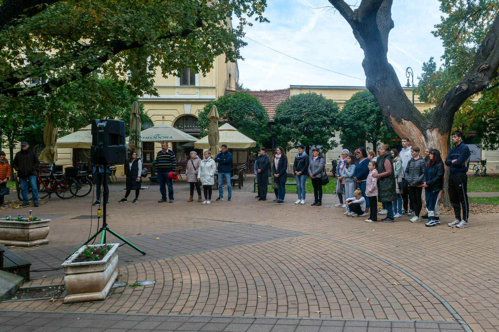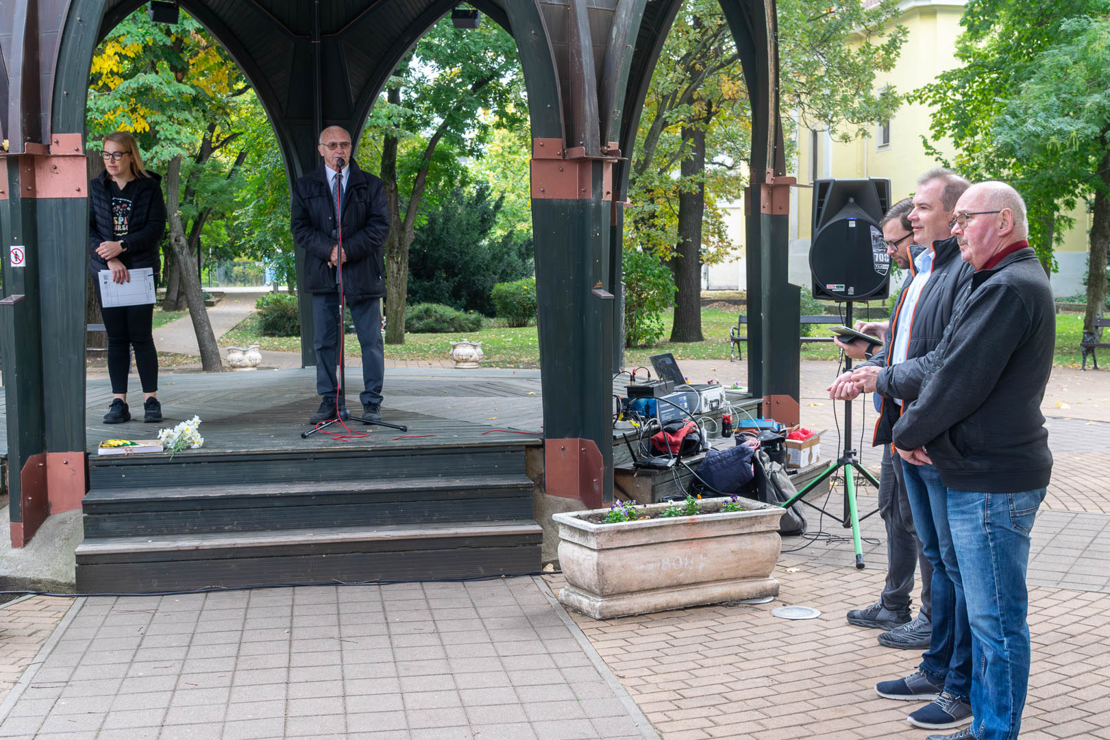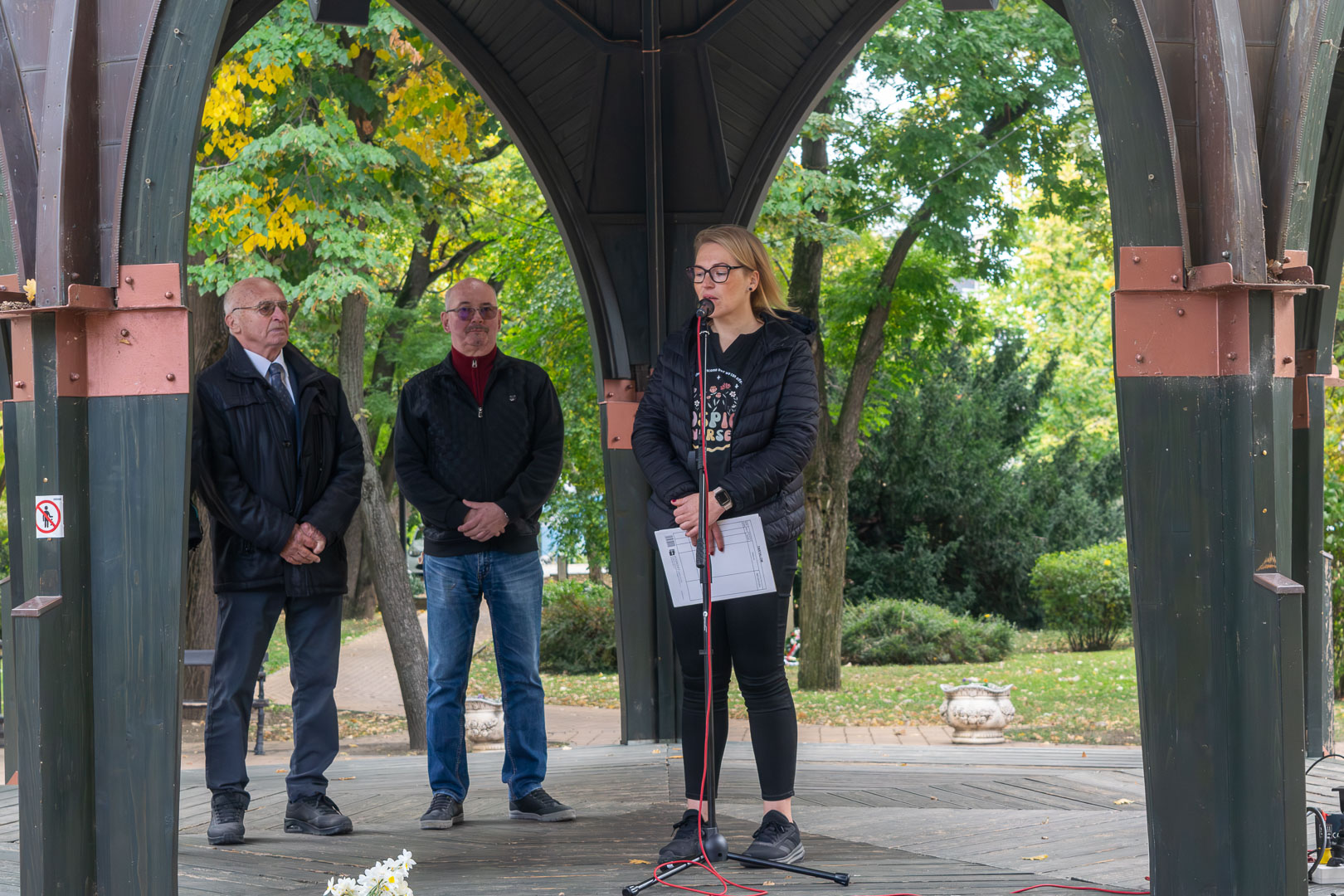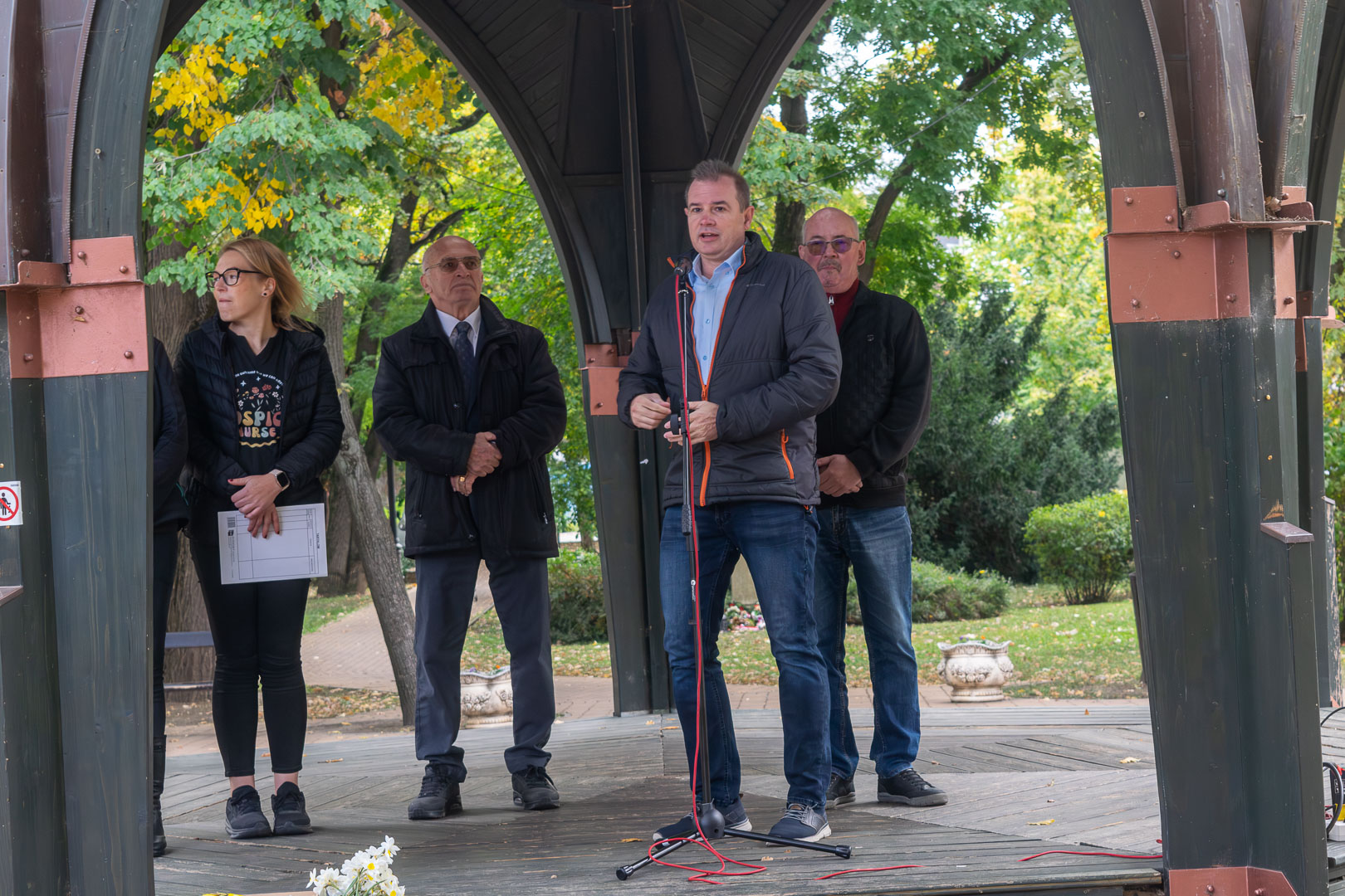 A Zenepavilonnál október 11-én dr. Bencze Sándor a Dr. Bencze és Társa Kft. vezetője üdvözölte a megjelenteket, néhány szóval bemutatva munkájukat, amit Szarvason húsz éve végeznek a betegek otthonában. Hangsúlyozta, hogy ez az ellátás TB-finanszírozott, vagyis az igénybevevőknek ingyenes, minden hospice-ellátásra szorulónak joga van hozzá, a háziorvosnak pedig kötelező felajánlani a szolgáltatás lehetőségét. Hodálik Pál polgármester megköszönte dr. Bencze Sándornak és munkatársainak, hogy foglalkoznak Szarvason a Hospice-ellátással. Elmondta azt is, hogy a januártól önkormányzati fenntartású szakrendelés keretében a 25 ágyas fekvőbeteg intézmény 10 hospice ágyat is működtet majd, erre már „rábólintott” a hatóság. Hajdu Andrea hospice-ellátó koordinátor – aki kollégájával, Nagy Judittal közösen kezdeményezte és szervezte a világnap szarvasi megrendezését – beszélt arról, hogy a gyógyíthatatlan betegek és hozzátartozóik milyen segítségeket kaphatnak, s miképpen könnyítheti ez meg mindannyiuk napjait. Hanzel László is ugyanerről beszélt a hozzátartozók nevében, s remélte, hogy a napjainkban még kissé elhanyagolt terület nem lesz tabutéma. Mindenkit bíztatott arra, hogy ezzel a problémával szembekerülve bátran forduljanak a Dr. Bencze és Társa Kft.-hez. Mielőtt a reményt és a megbékélést szimbolizáló – tavasszal a legkorábban kinyíló virágok egyikét, a – nárciszt elültették volna a Kossuth téri virágtartókba, dr. Bencze Sándor megköszönte Csapó Julianna munkáját, aki a szarvasi Hospice-ellátás elindítója volt.