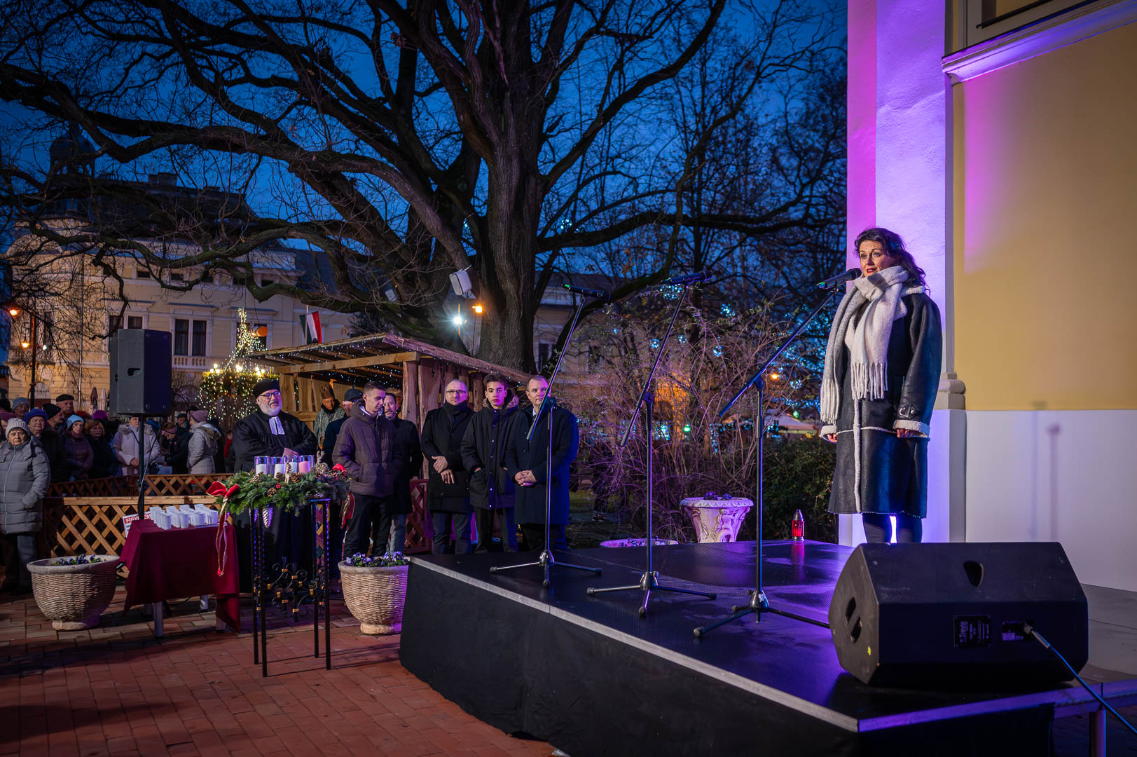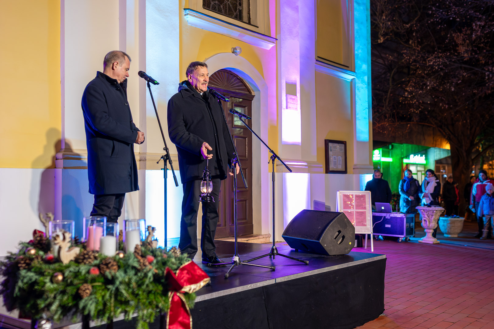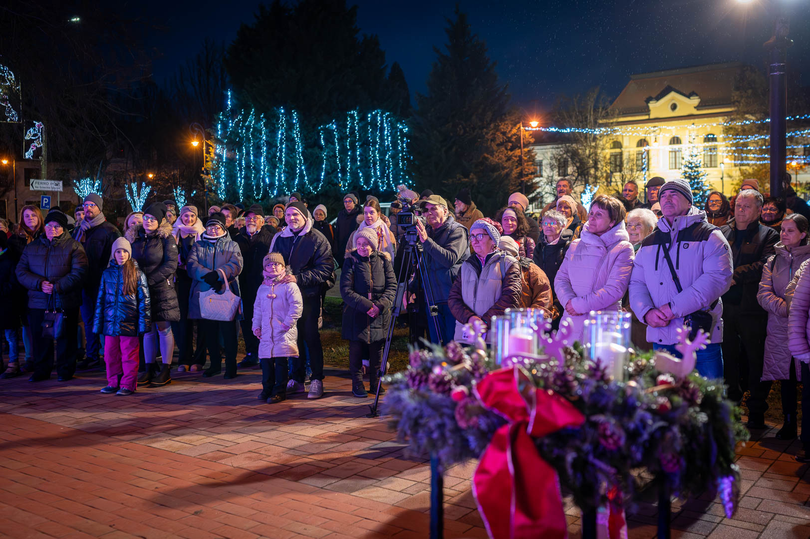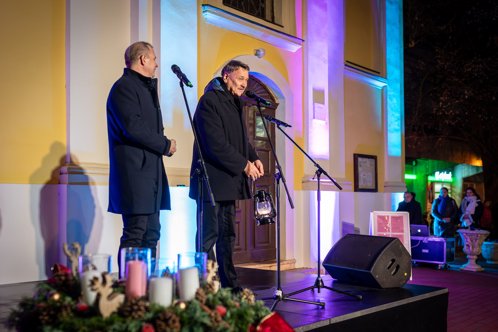 Bohák Péter köszöntötte advent harmadik vasárnapján a Szent Klára római katolikus templom előtt gyülekezőket, majd színpadra kérte Schupp Gabriellát, a Cervinus Teátrum színészét egy karácsonyi dal erejéig.