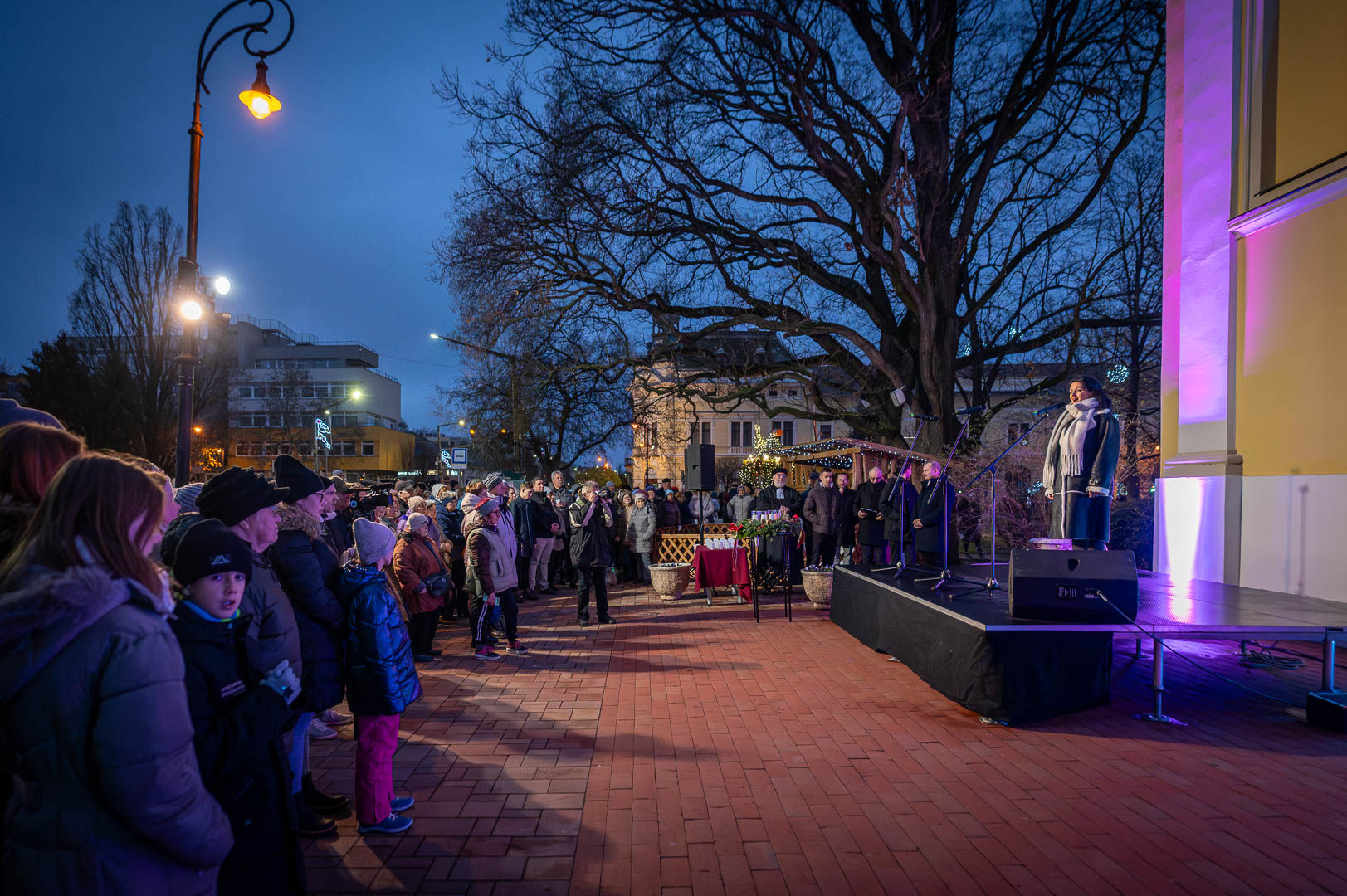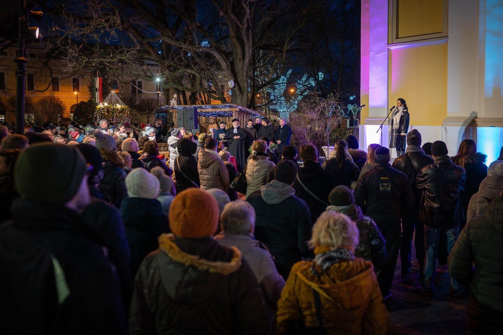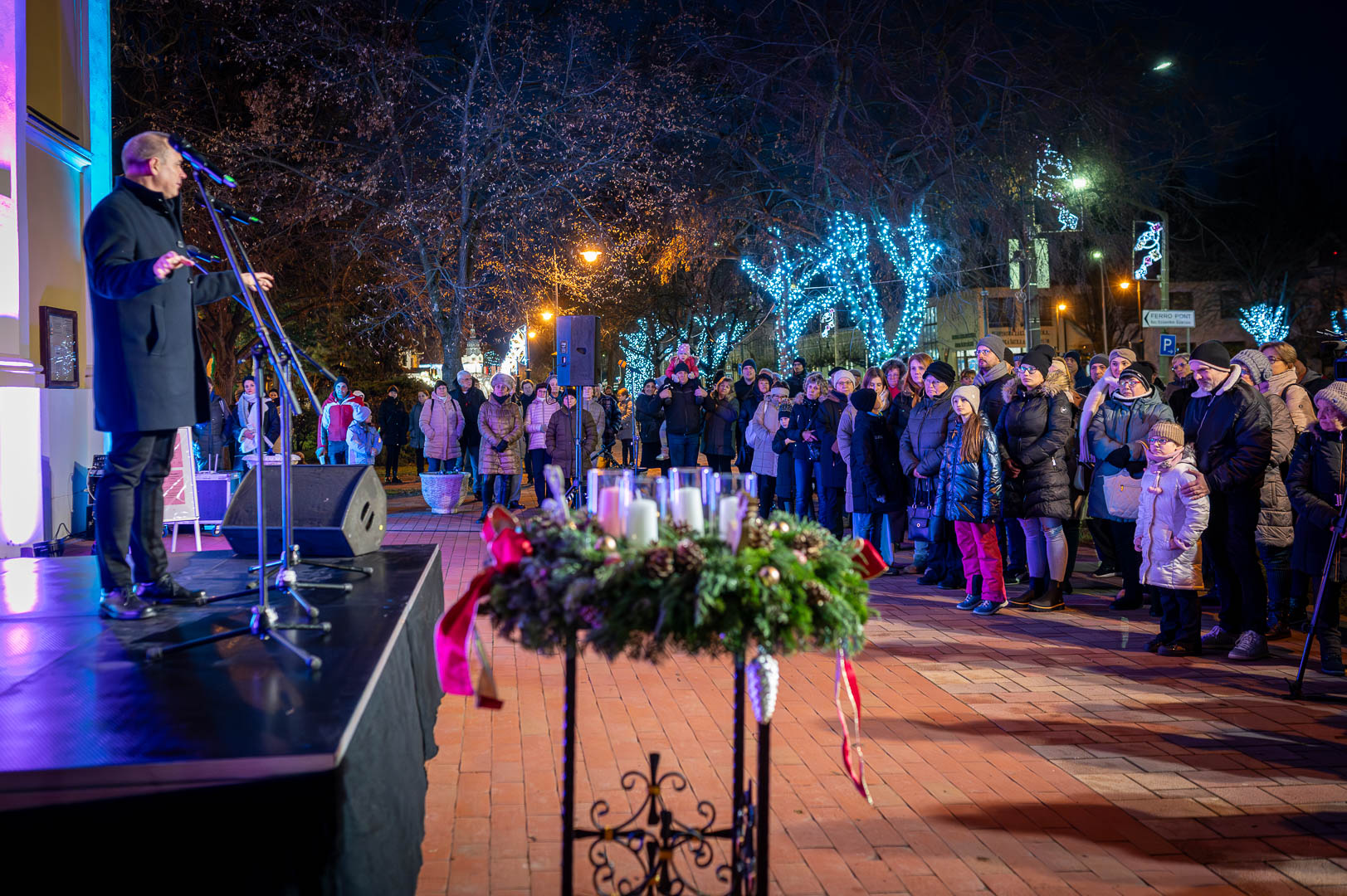 Bohák Péter köszöntötte advent harmadik vasárnapján a Szent Klára római katolikus templom előtt gyülekezőket, majd színpadra kérte Schupp Gabriellát, a Cervinus Teátrum színészét egy karácsonyi dal erejéig.