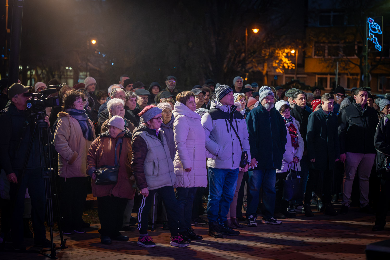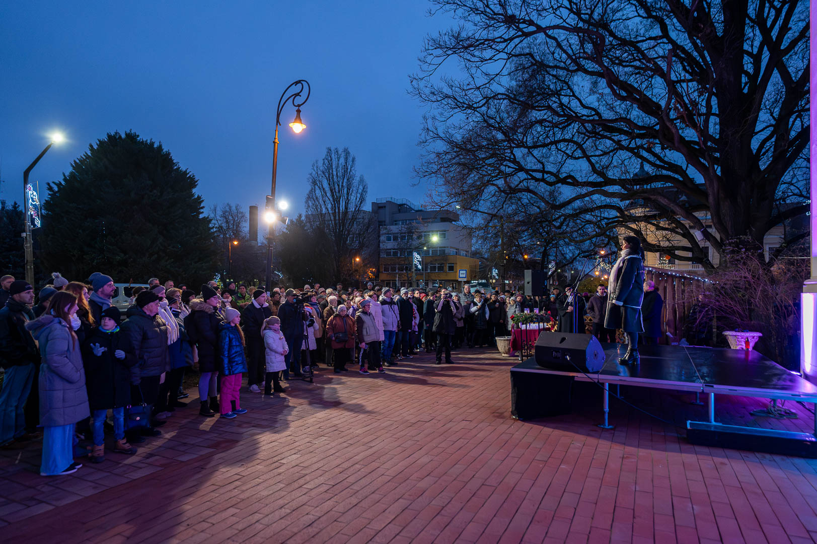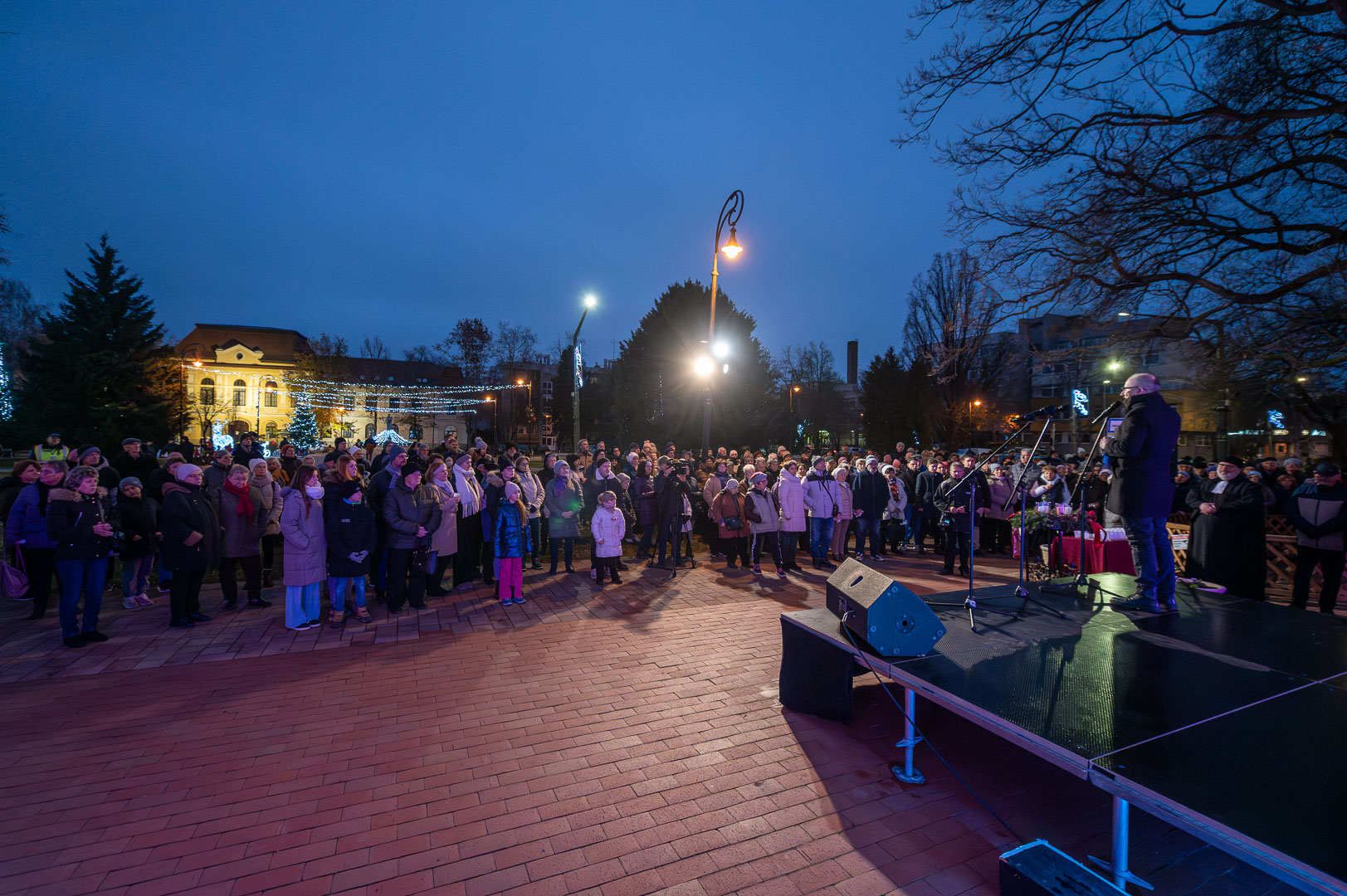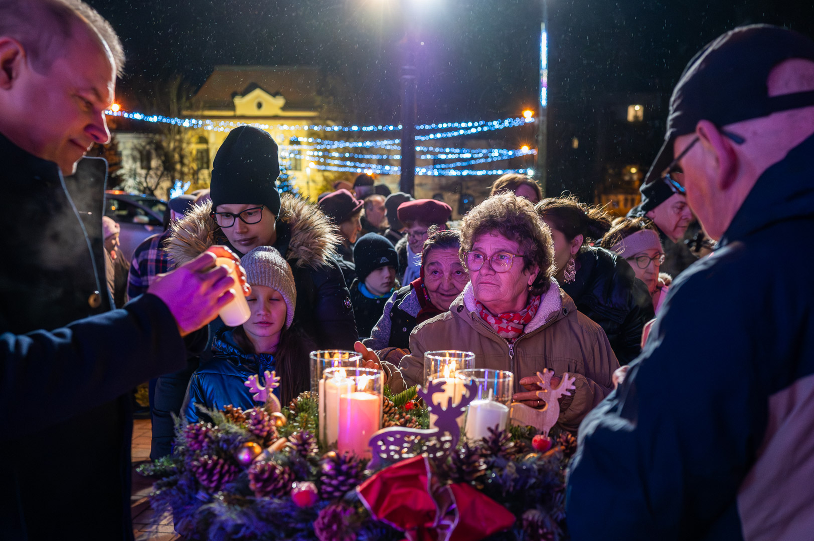 Bohák Péter köszöntötte advent harmadik vasárnapján a Szent Klára római katolikus templom előtt gyülekezőket, majd színpadra kérte Schupp Gabriellát, a Cervinus Teátrum színészét egy karácsonyi dal erejéig.
