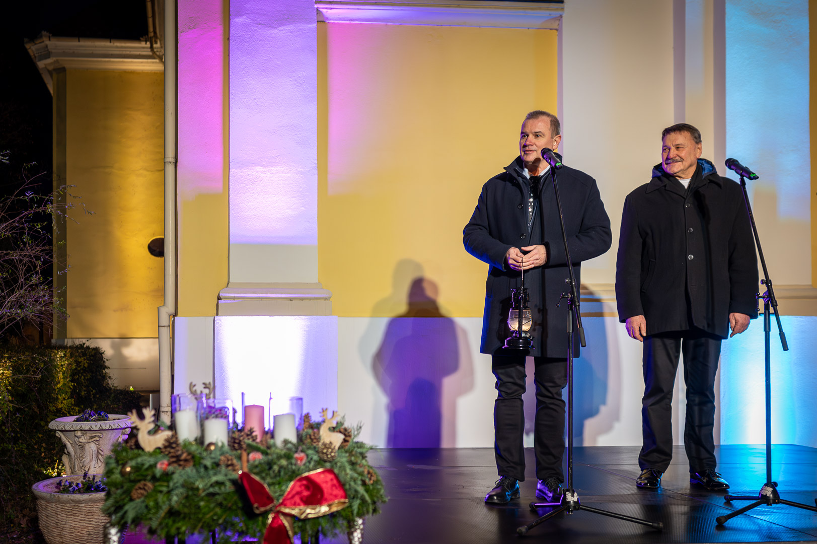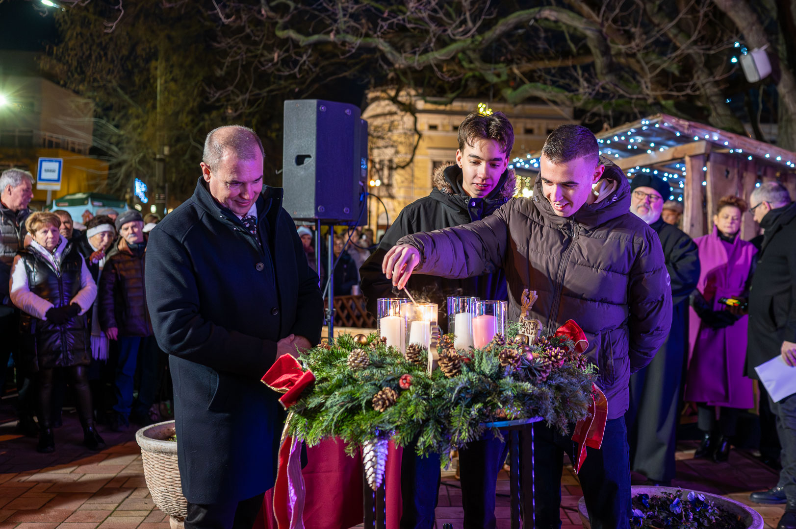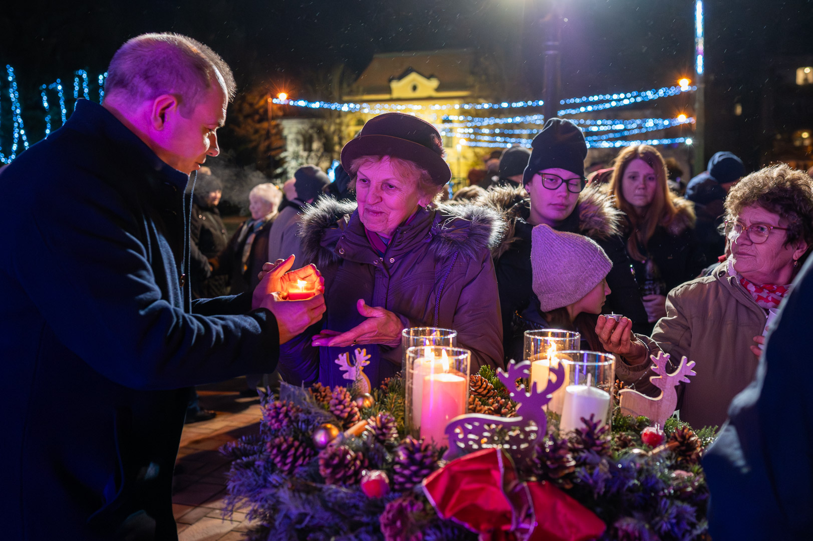 Hodálik Pál polgármester mielőtt átvette volna a betlehemi láng felelősétől, Závoda Ferenc képviselőtől a lángot őrző lámpást személyes történetekkel érzékeltette az öröm jelentőségét. Példaként a gyereket hozta, hogy a kicsik mennyire tudnak apró dolgoknak is őszintén örülni. Felidézte, hogyan kapott egy rajzot egy kisfiútól, aki polgármester szeretne lenni, és ebből kiindulva rámutatott: a felnőttek sokszor annyira rohannak, hogy észre sem veszik az élet apró örömeit. Hangsúlyozta, mennyire fontos megtanulni örülni mások sikerének is, hiszen az irigység az egyik legerősebb negatív érzés, ami gyengíti a közösséget.