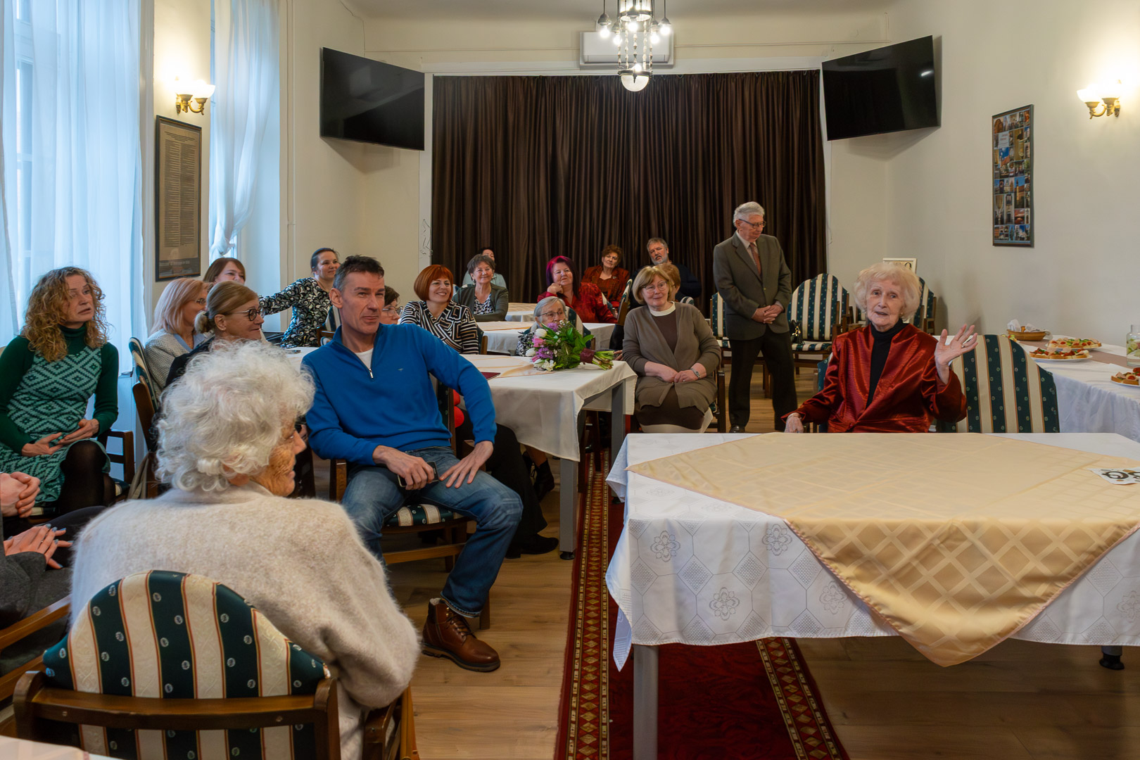 Természetesen torta is érkezett, amit az ünnepelt unokájával, Dombvári Bencével közösen szeletelt fel és kínált az ünnepség résztvevőinek. A torta után a fehér asztalok mellett tovább folytatódott Gabi nénivel a beszélgetés, az emlékek és élmények sokaságának felidézése.