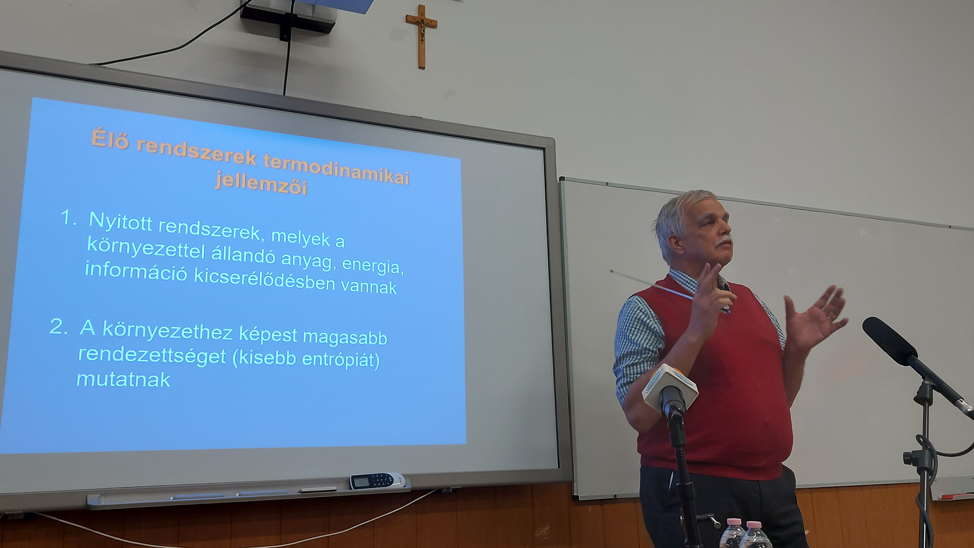 Az előadás az univerzum hajnalától, az ősrobbanástól indult. Egy szemléletes példán keresztül rávilágított: ha a mindenség történetét egyetlen naptári évbe sűrítjük, az emberiség teljes történelme mindössze az utolsó 4 másodpercet teszi ki. Ezt követően a figyelmet a mikroszkopikus folyamatokra irányította, részletezve a szénvegyületek szerepét az energiagazdálkodásban és a tápanyagok hasznosításában. Kiemelte, hogy az élő rendszerek dinamikus egyensúlya az egészség, a fejlődés és az öregedés biológiai alapköve.