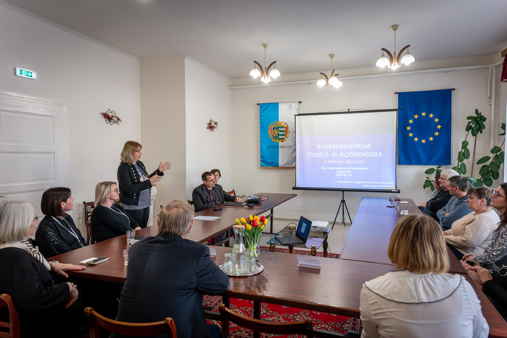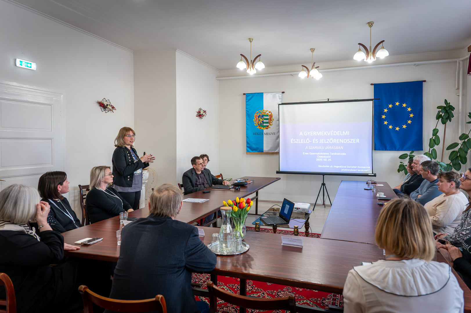 Dr. Hegedűsné Demeter Zsuzsanna jelzőrendszeri tanácsadó a jelzőrendszer többszintű felépítését és jogi hátterét ismertette, külön hangsúlyozva, hogy 2024 szeptemberétől a jelzés elmaradása büntetőjogi felelősséggel jár. Kiemelte, hogy minden állampolgár a jelzőrendszer tagja, de a szakembereknek (pedagógusoknak, egészségügyi dolgozóknak) különösen szigorú protokollokat kell követniük. A tanácsadó hangsúlyozta az írásos jelzés fontosságát és a három munkanapos intézkedési kötelezettséget.