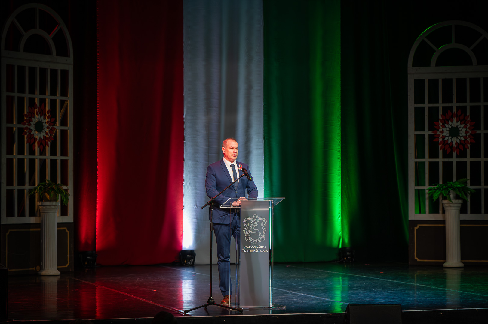 A közülük elsőként felszólaló Hodálik Pál polgármester nem szeretett volna elémenni az őt követő Závogyán Magdolna kultúráért felelős államtitkár és Dankó Béla országgyűlési képviselő gondolatainak, ezért egy modern megoldásként a mesterséges intelligenciát kérdezte meg, foglalja össze, “ő” mit tud a magyar szabadság és az összefogás ünnepéről. A mindennapjainkba mostanában beköltözött társunk felsorolta a magyar történelem nagy pillanatait István királytól a 2010–2020-as gazdasági fellendülésig, közben érintve Mátyás király, Rákóczi, 1848, a kiegyezés, a Trianon utáni újjáépítés, 1956 és 1989 témaköreit, amikből a következő közös tanulságot vonta le: a magyarok akkor teljesítettek a legjobban, amikor a szabadságért, szuverenitásért és megmaradásért összefogva küzdöttek. Hodálik Pál arra kérte a szarvasiakat, nyilvánítsanak véleményt a választáson, mert ez demokratikus lehetőség az ország sorsának eldöntésére – akár a ’48-as fiatalok összefogása –, miközben nagyhatalmak játszmái közepette navigálunk “Magyarország kis csónakjával” a történelem viharos tengerén.