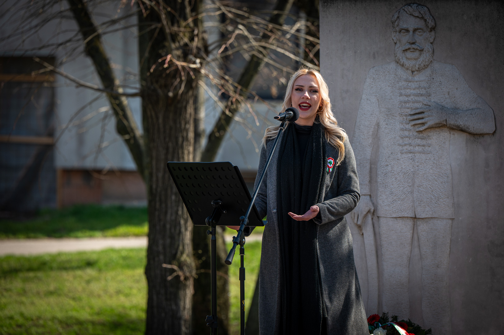Az őt követő Gaál Zsófi énekes színművész nemcsak mint előadó, hanem első sorban mint magyar köszöntötte az ünneplőket. Versekkel, prózával és dalokkal átszőtt előadásában összefoglalta, mit jelent számára, számunkra ez a nap: Március 15-e a magyar nemzet számára nem csupán egy történelmi dátum, hanem a szabadság, az igazság és a méltóság iránti örök vágy szimbóluma, amely generációkon átívelve lüktet a szívekben. Az 1848-as forradalom eszméje szoros egységet alkot a múlt hősies küzdelmeivel, például II. Rákóczi Ferenc jelmondatával, összekötve a Pilvax kávéház lelkes ifjait a hazáért és szabadságért vívott korábbi harcokkal. Ez a nap a közös örökségről szól, amelyben a szavak ereje, a 12 pont követelései és a Nemzeti dal buzdítása egyetlen elszánt nemzetté kovácsolta a magyarságot. Az ünnepi emlékezésében ugyanakkor a frontvonalak mögötti csendes hősök, az édesanyák és feleségek áldozatvállalása előtt is tisztelgett, akik hittel és reménnyel őrizték az otthont, miközben szeretteiket a csatába engedték. Március 15-e üzenete így válik teljessé: a nemzet ereje nemcsak a harctéri helytállásban, hanem a családok összetartásában és a Kárpát-medencei közös gyökerekben rejlik. Ez a nap arra emlékeztet bennünket, hogy a magyar nép mindaddig él és létezik, amíg képes bízni a jövőben és megőrizni kulturális és lelki egységét.