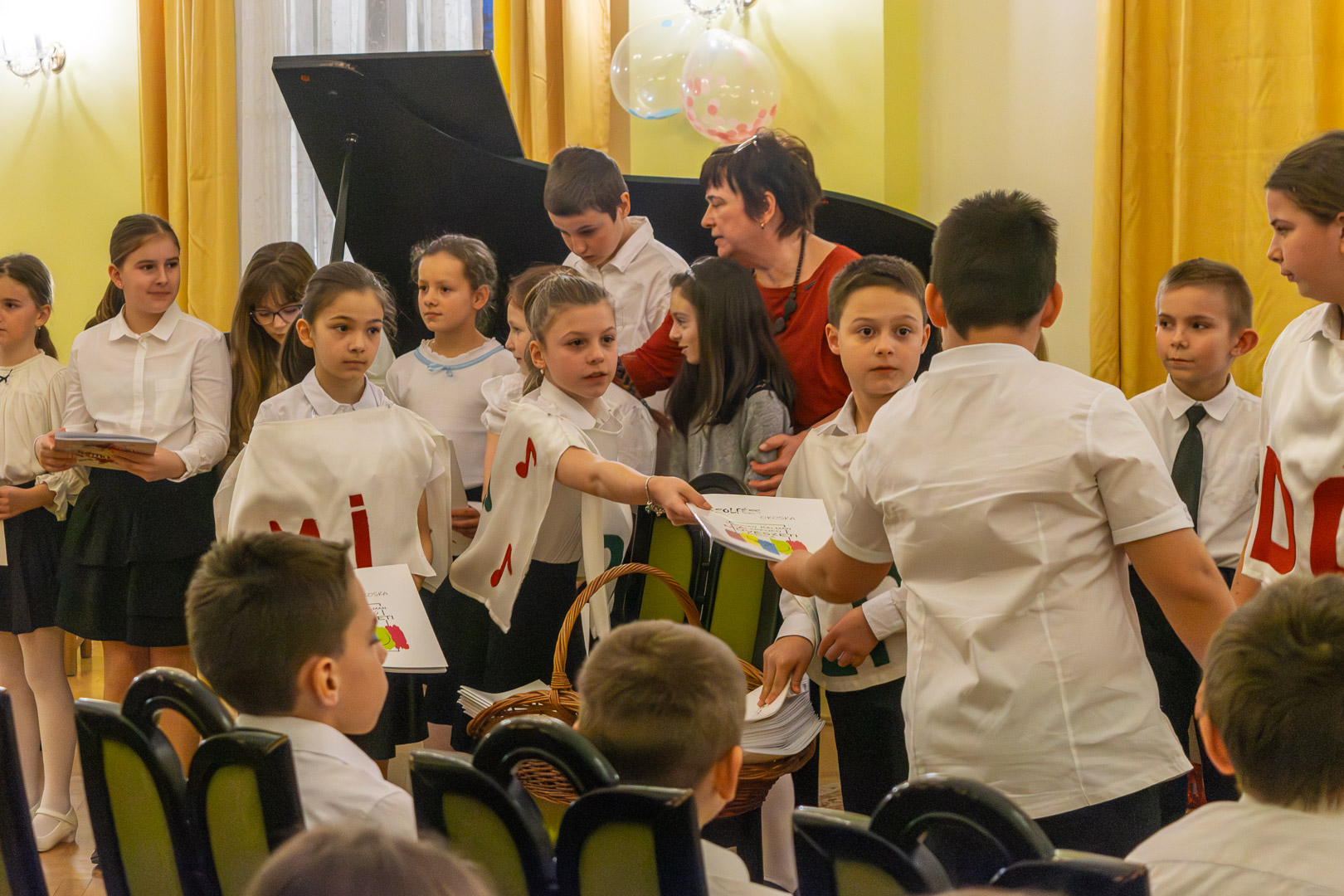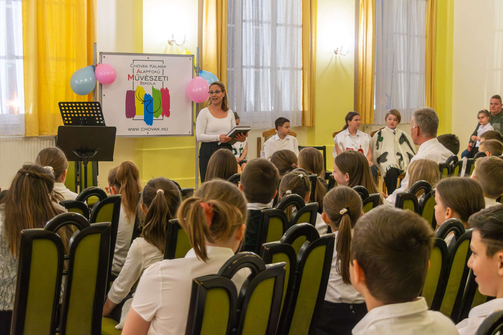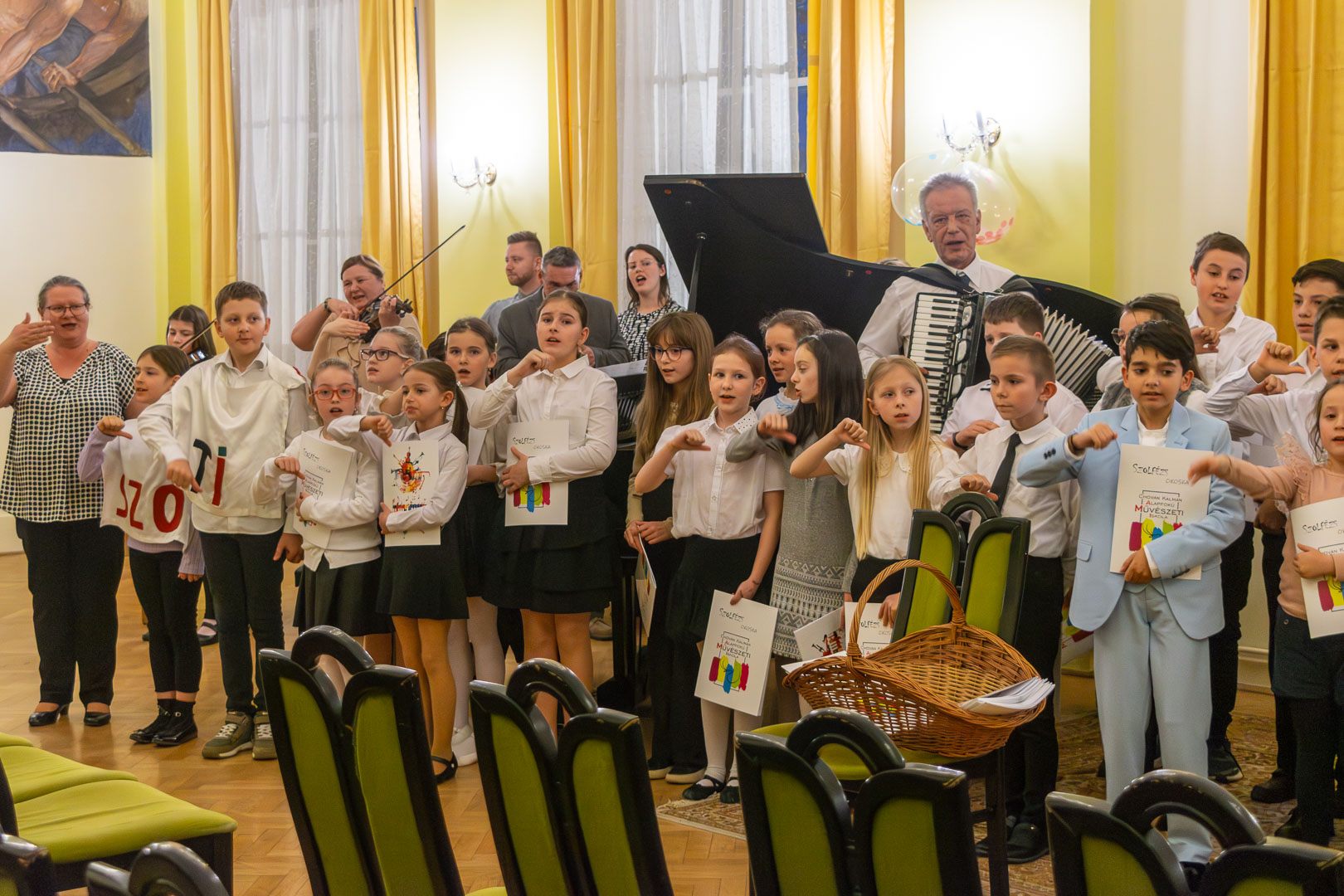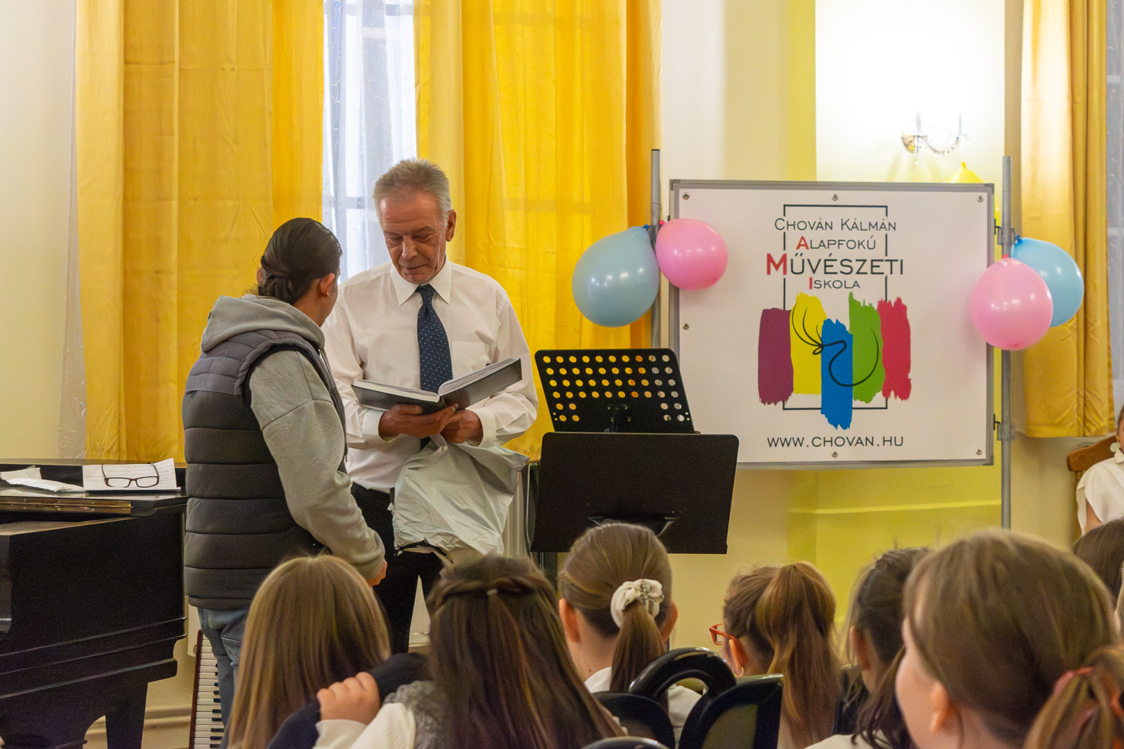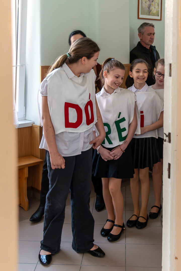 A válaszadásban is a felsőbb éves növendékek és a zenepedagógusok voltak a gyerekek segítségére, így egy élvezetes koncert közben ismerhettük meg a hangszereket, hangszercsaládokat, s más egyéb – a zenével kapcsolatos – tudásra tehettünk szert valamennyien a teremben. Így természetesen nem maradt el a katarzis sem a végén, megkerült a „Nagykönyv”, így Budai Barbara, igazgatóhelyettes név szerint szólíthatta az elsősöket, akik egy Szolfézs Okoska elnevezésű, csak a Chovánban beszerezhető füzetet kaptak ajándékba plusz egy dalt: a szülők és pedagógusok a Tavaszi szél vizet áraszt c. népdallal köszöntötték az ifjú zenészeket. Végül pedig mindenki énekelte a Muzsia hangjából, hogy: Dó, egy domb, egy szép zöld domb, / Ré, egy régen látott rét, / Mi, mi együtt ez a mi, / Fá, a fák fölött az ég, / Szó, egy szó, szórakoztató, / Lá, és örül aki lát, / Ti, ti tudjátok is már, hogy most újra itt a Dó!