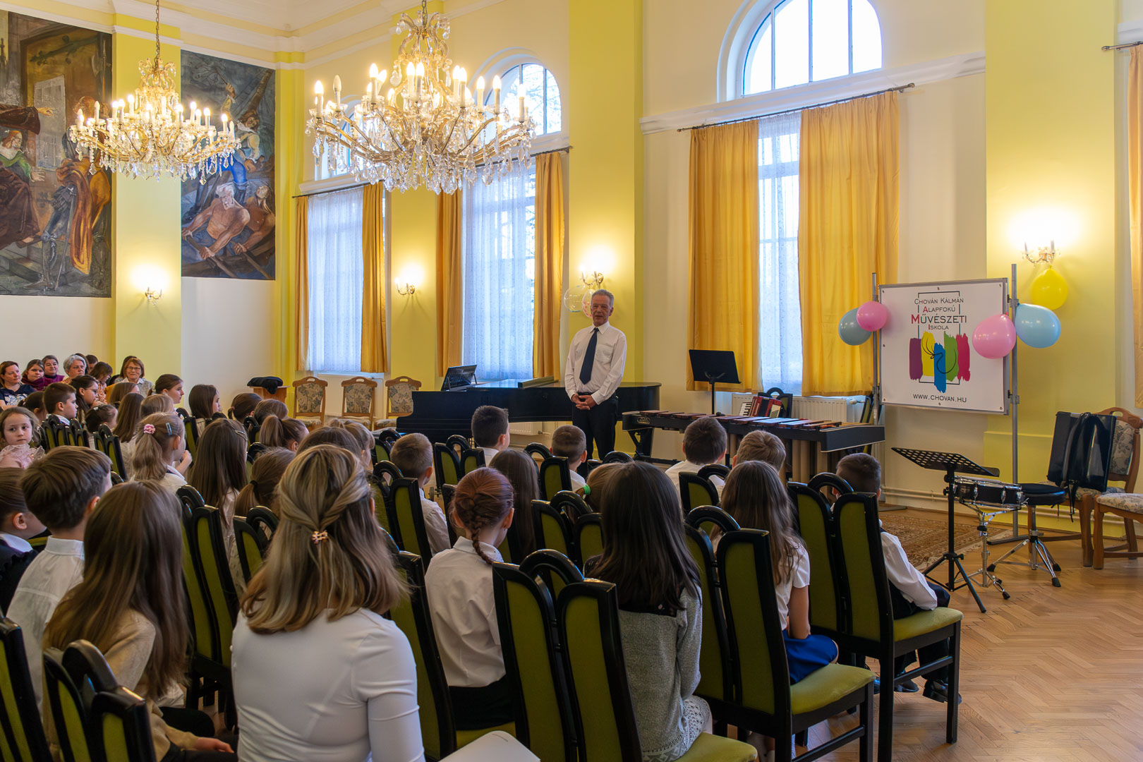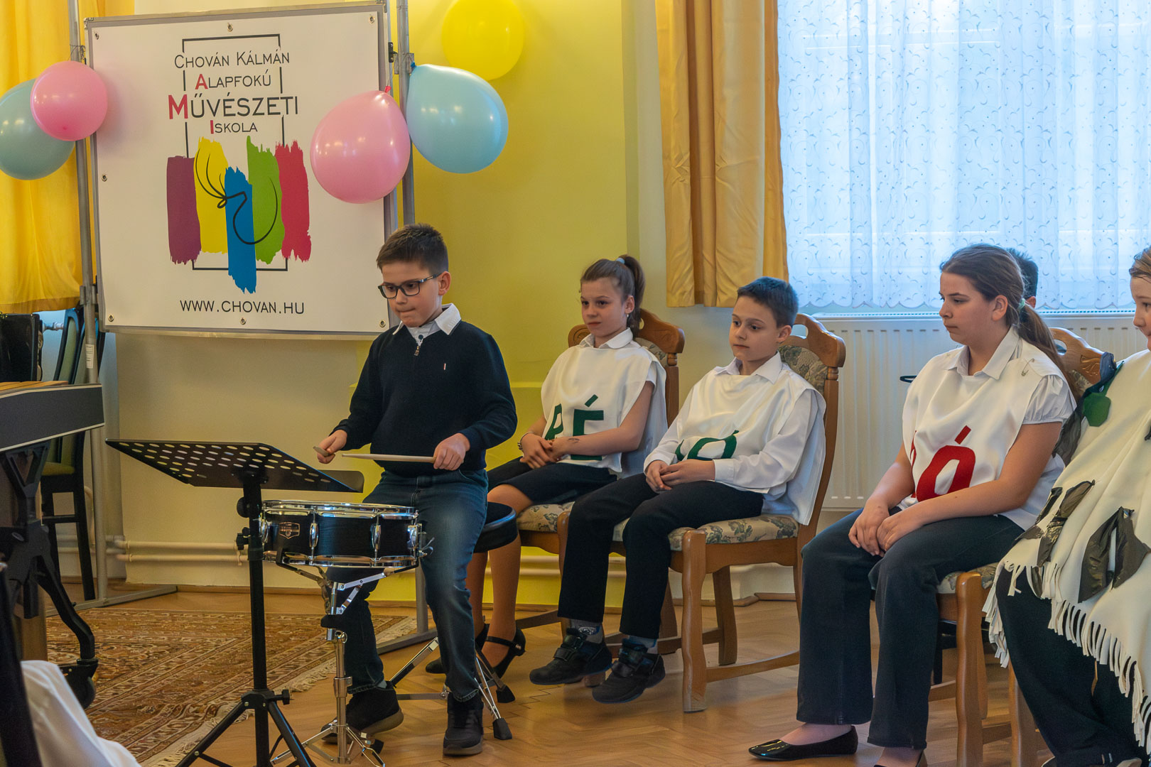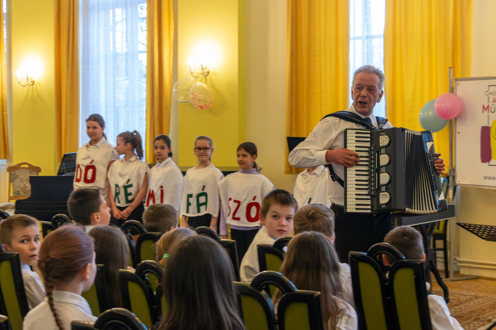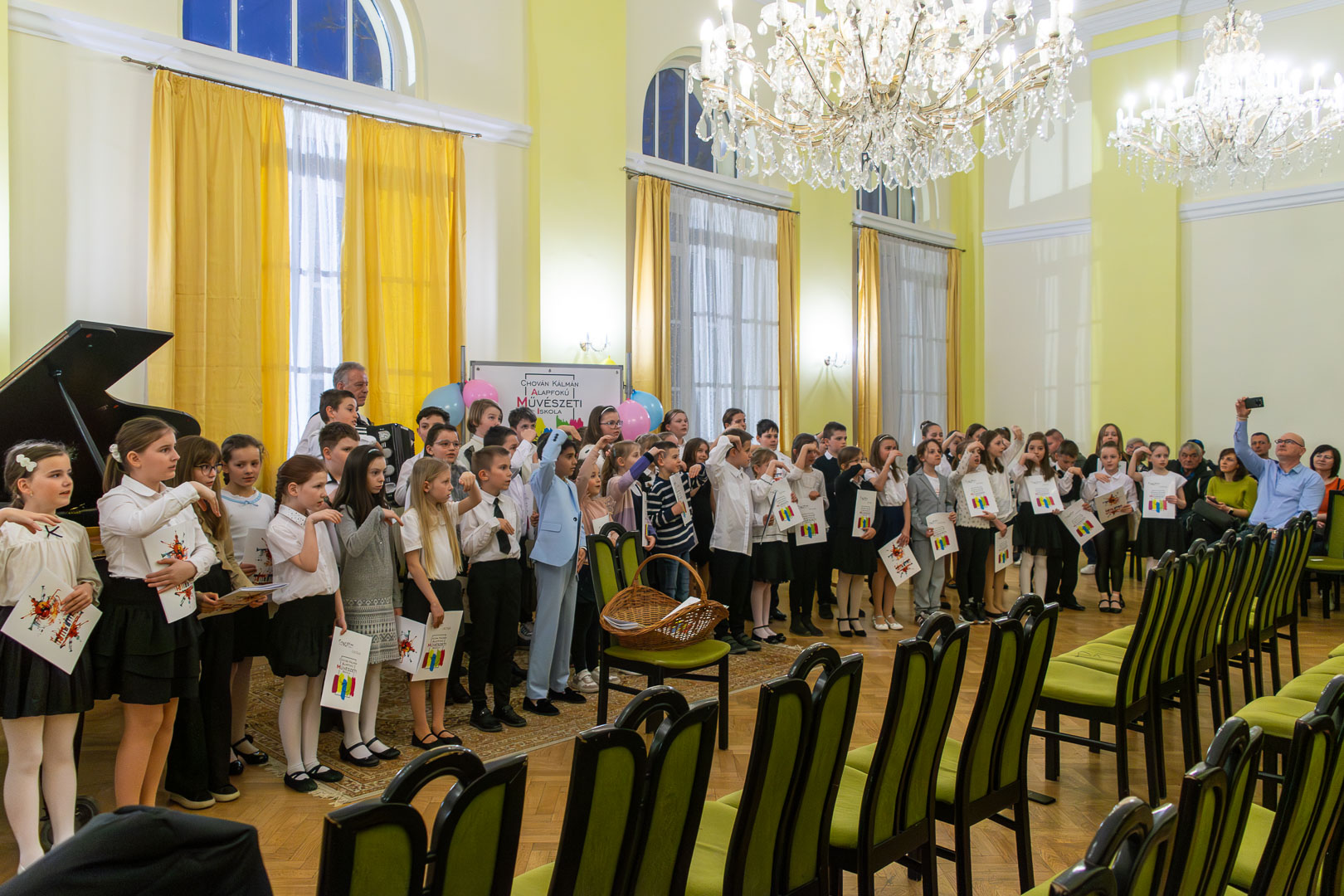 A válaszadásban is a felsőbb éves növendékek és a zenepedagógusok voltak a gyerekek segítségére, így egy élvezetes koncert közben ismerhettük meg a hangszereket, hangszercsaládokat, s más egyéb – a zenével kapcsolatos – tudásra tehettünk szert valamennyien a teremben. Így természetesen nem maradt el a katarzis sem a végén, megkerült a „Nagykönyv”, így Budai Barbara, igazgatóhelyettes név szerint szólíthatta az elsősöket, akik egy Szolfézs Okoska elnevezésű, csak a Chovánban beszerezhető füzetet kaptak ajándékba plusz egy dalt: a szülők és pedagógusok a Tavaszi szél vizet áraszt c. népdallal köszöntötték az ifjú zenészeket. Végül pedig mindenki énekelte a Muzsia hangjából, hogy: Dó, egy domb, egy szép zöld domb, / Ré, egy régen látott rét, / Mi, mi együtt ez a mi, / Fá, a fák fölött az ég, / Szó, egy szó, szórakoztató, / Lá, és örül aki lát, / Ti, ti tudjátok is már, hogy most újra itt a Dó!