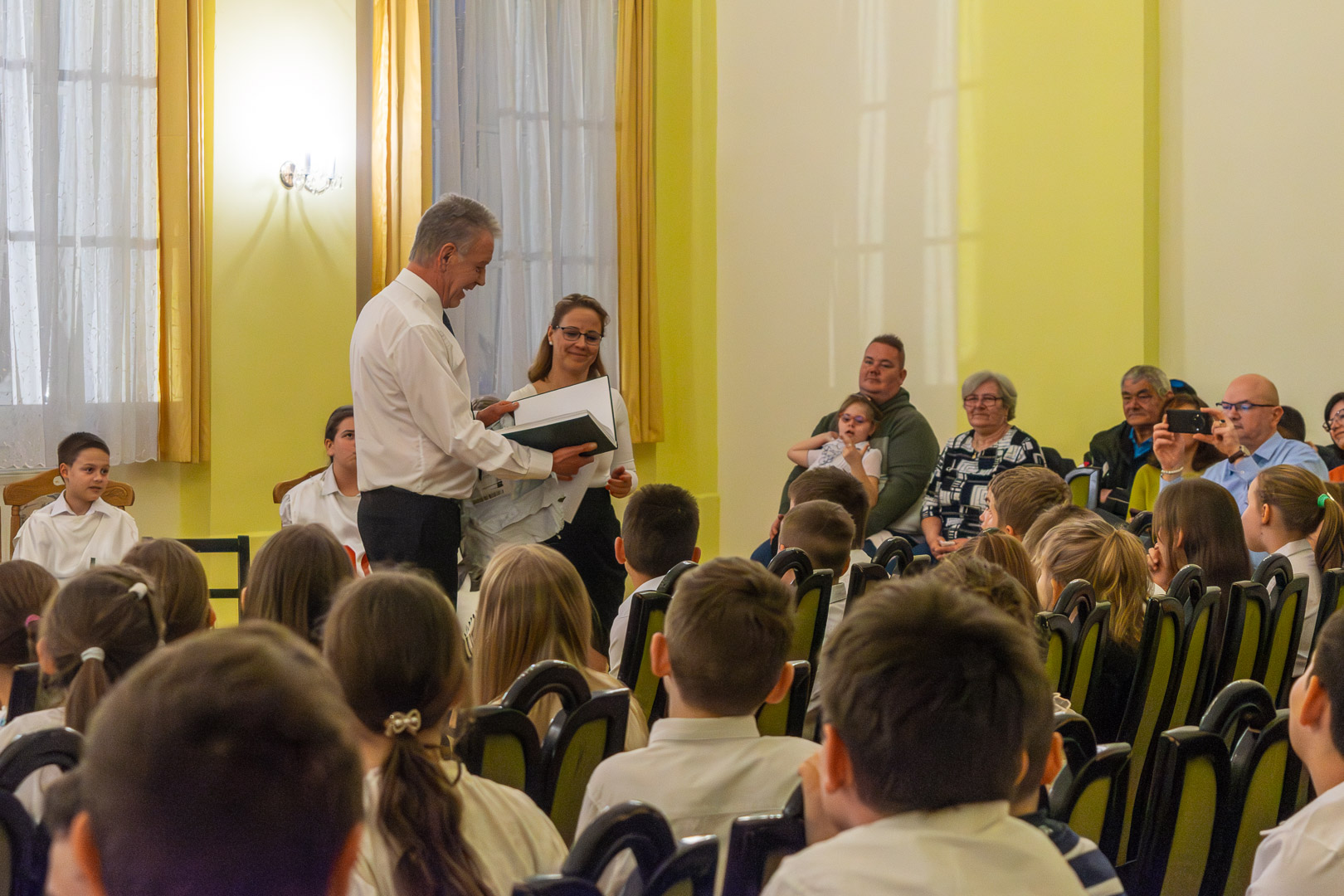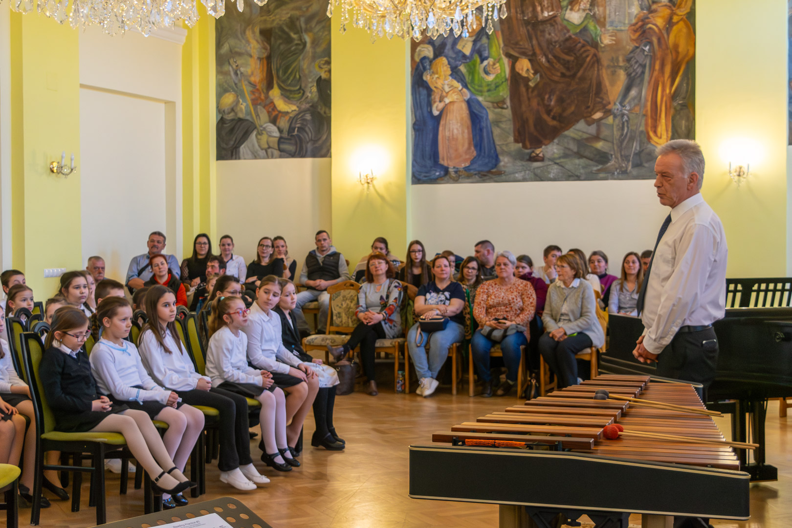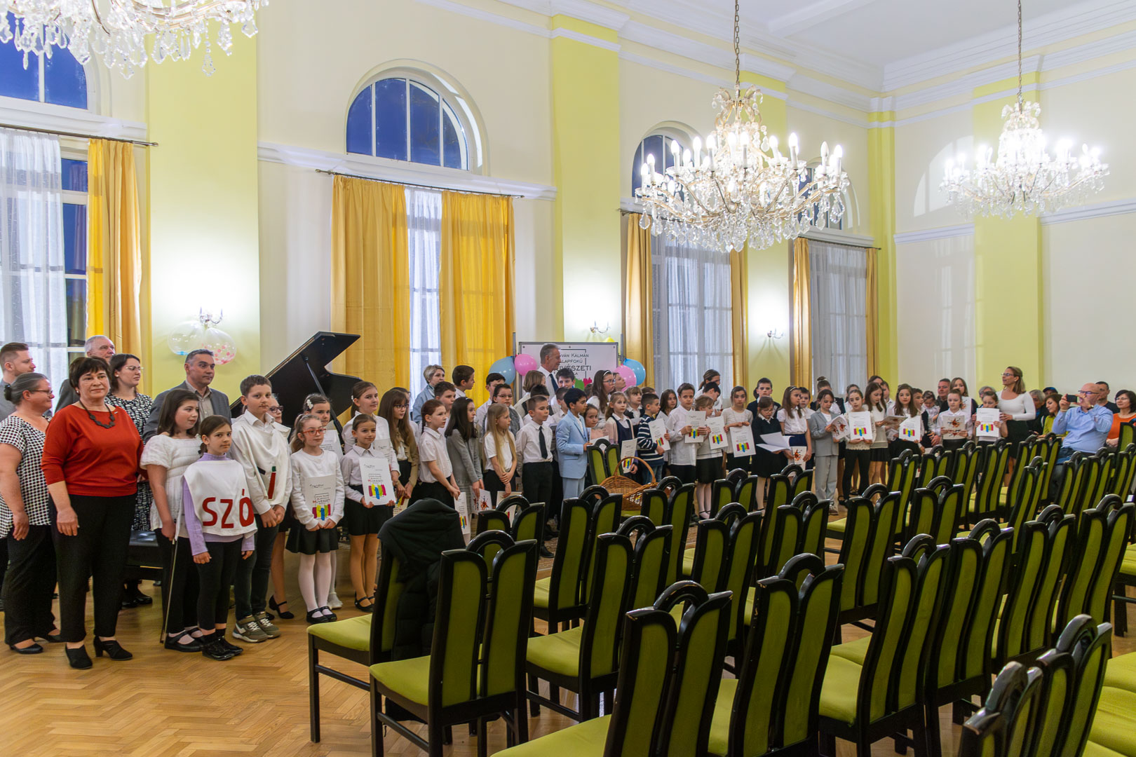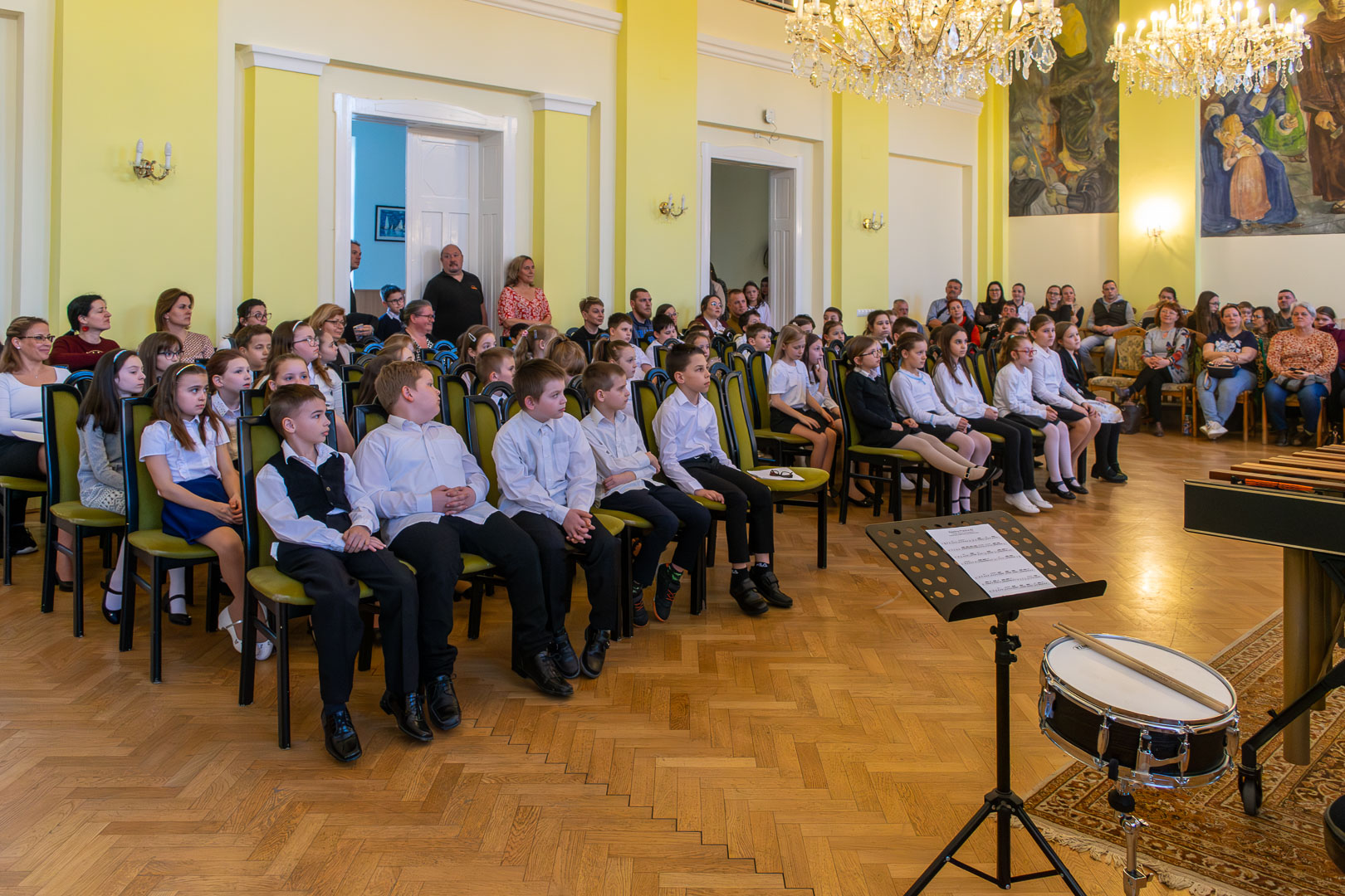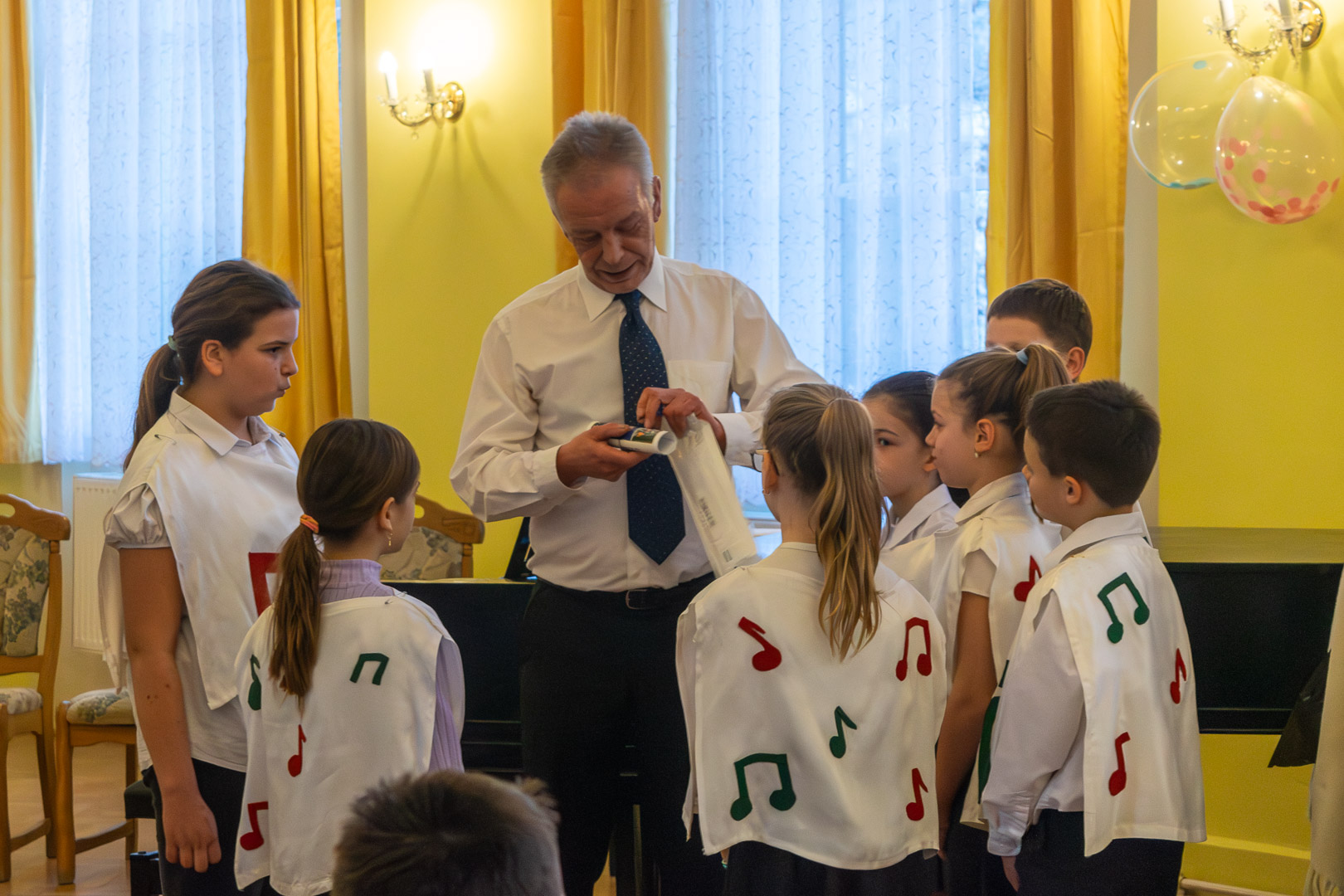 A válaszadásban is a felsőbb éves növendékek és a zenepedagógusok voltak a gyerekek segítségére, így egy élvezetes koncert közben ismerhettük meg a hangszereket, hangszercsaládokat, s más egyéb – a zenével kapcsolatos – tudásra tehettünk szert valamennyien a teremben. Így természetesen nem maradt el a katarzis sem a végén, megkerült a „Nagykönyv”, így Budai Barbara, igazgatóhelyettes név szerint szólíthatta az elsősöket, akik egy Szolfézs Okoska elnevezésű, csak a Chovánban beszerezhető füzetet kaptak ajándékba plusz egy dalt: a szülők és pedagógusok a Tavaszi szél vizet áraszt c. népdallal köszöntötték az ifjú zenészeket. Végül pedig mindenki énekelte a Muzsia hangjából, hogy: Dó, egy domb, egy szép zöld domb, / Ré, egy régen látott rét, / Mi, mi együtt ez a mi, / Fá, a fák fölött az ég, / Szó, egy szó, szórakoztató, / Lá, és örül aki lát, / Ti, ti tudjátok is már, hogy most újra itt a Dó!