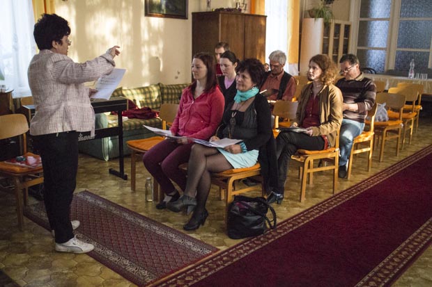 Az elmúlt hét hétfőjén látogattunk el a próbára, ahol éppen hangképzési gyakorlat folyt és kérdeztük céljaikról a kórus vezetőjét.