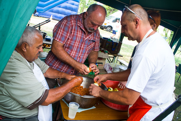 Eközben a többiek gyakorlott mozdulatokkal darálták, gyúrták, fűszerezték és töltötték a halhúst, a déli órákban pedig jutott mindenkinek kóstoló is. Kiss József szerint a titok a darálásban rejlik. Ezt követően ugyanis eltűnnek a szálkák, és szinte bármilyen általunk kedvelt húsos ételt készíthetünk. Példaként említette a töltött káposztát, a bolognait és a pizzafeltétet, a sátorok között sétálva pedig később újabb ékes bizonyítékot találtunk a hal sokoldalú felhasználására.