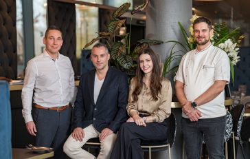 • Szin Bence és Szinné Pusztai Szilvia, az Újváros Bisztró tulajdonosai, balról Gál Csaba étteremvezető, jobból Piltz Zoltán séf.