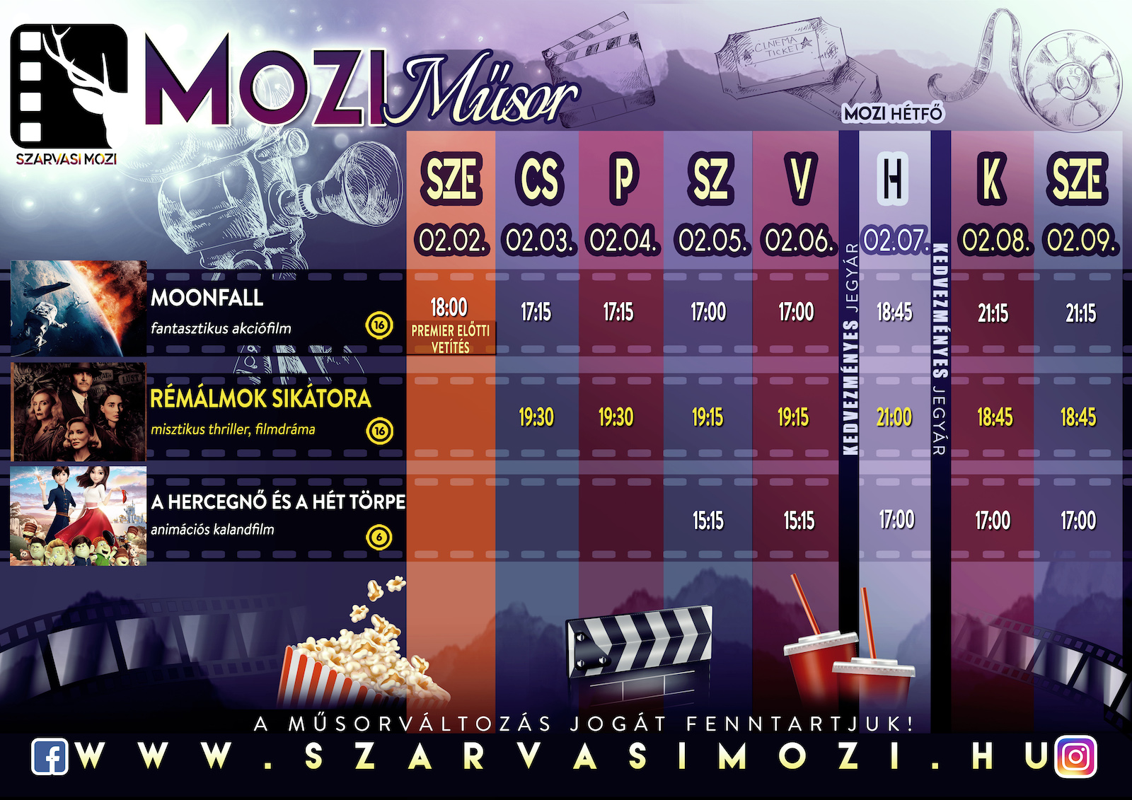 5. heti moziműsorsze02feb(feb 2)18:00sze09(feb 9)22:0018:00 - 22:00 (9) Szarvasi Mozi, Kossuth tér 3.Completed