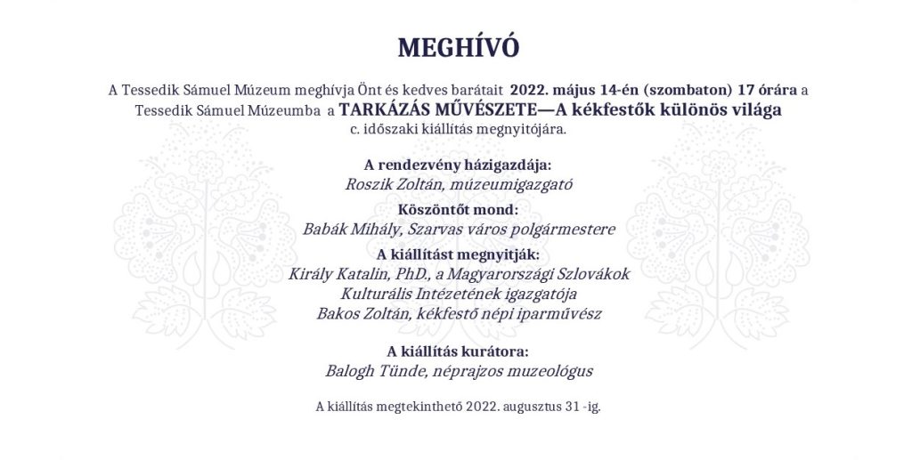 A tarkázás művészeteszo14máj17:00szo17:3017:00 - 17:30 Tessedik Sámuel Múzeum, Vajda Péter u. 1.Completed