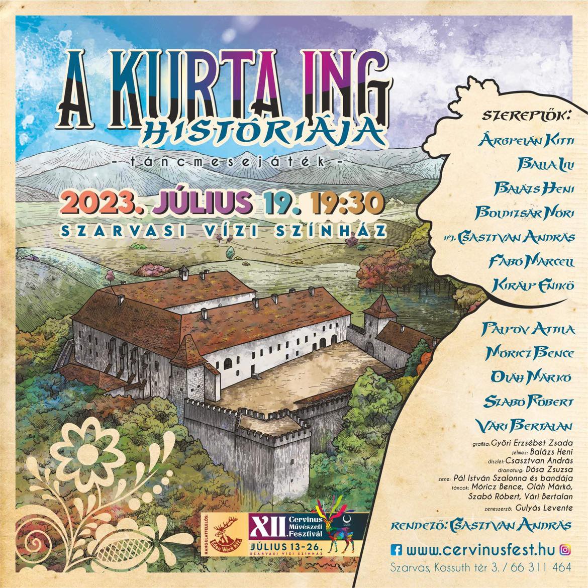 július 19. 19:30 – A KURTA ING HISTÓRIÁJA – táncmesejáték Jegyár: 3500, 3000, 2500, 2000, 1800 Talán kevesen tudják, de Mátyás király közkedvelt uralkodó volt a szlovák nép körében is, sokat időzött a Bajmóci várban, ahol a kerti hársfák alatt tartotta tanácskozásait. Ennek emlékét mai napig őrzi Mátyás király Hársfája. A humort nem nélkülöző, bölcsességre és igazságoságra épülő történet egyedi, hiszen a szlovákiai gyűjtések kevésbé ismertek és publikáltak Magyarországon, Megtudhatjuk belőle miért is lett lett kurta a gyetvai férfiak inge. Rendező és koreográfus: Csasztvan András.