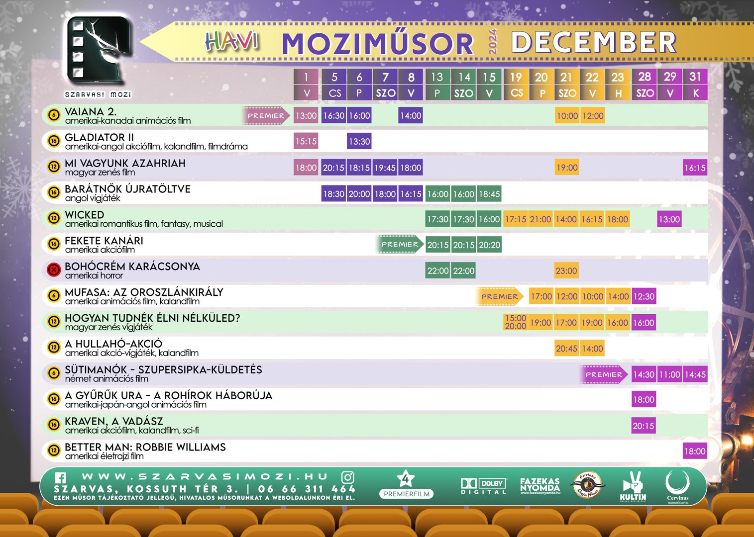 Decemberi moziműsorvas01dec13:00ke31(dec 31)18:0013:00 - 18:00 (31) Szarvasi Mozi, Kossuth tér 3.Completed