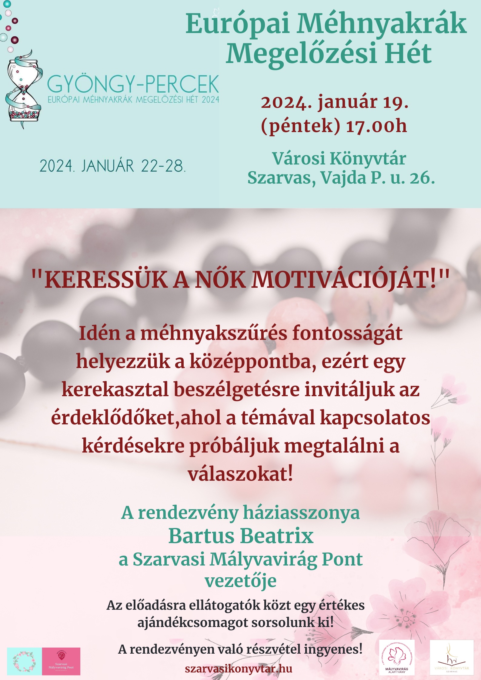 Európai méhnyakrák megelőzési hétpént19jan17:0017:00 Városi Könyvtár, Vajda Péter u. 26.Completed