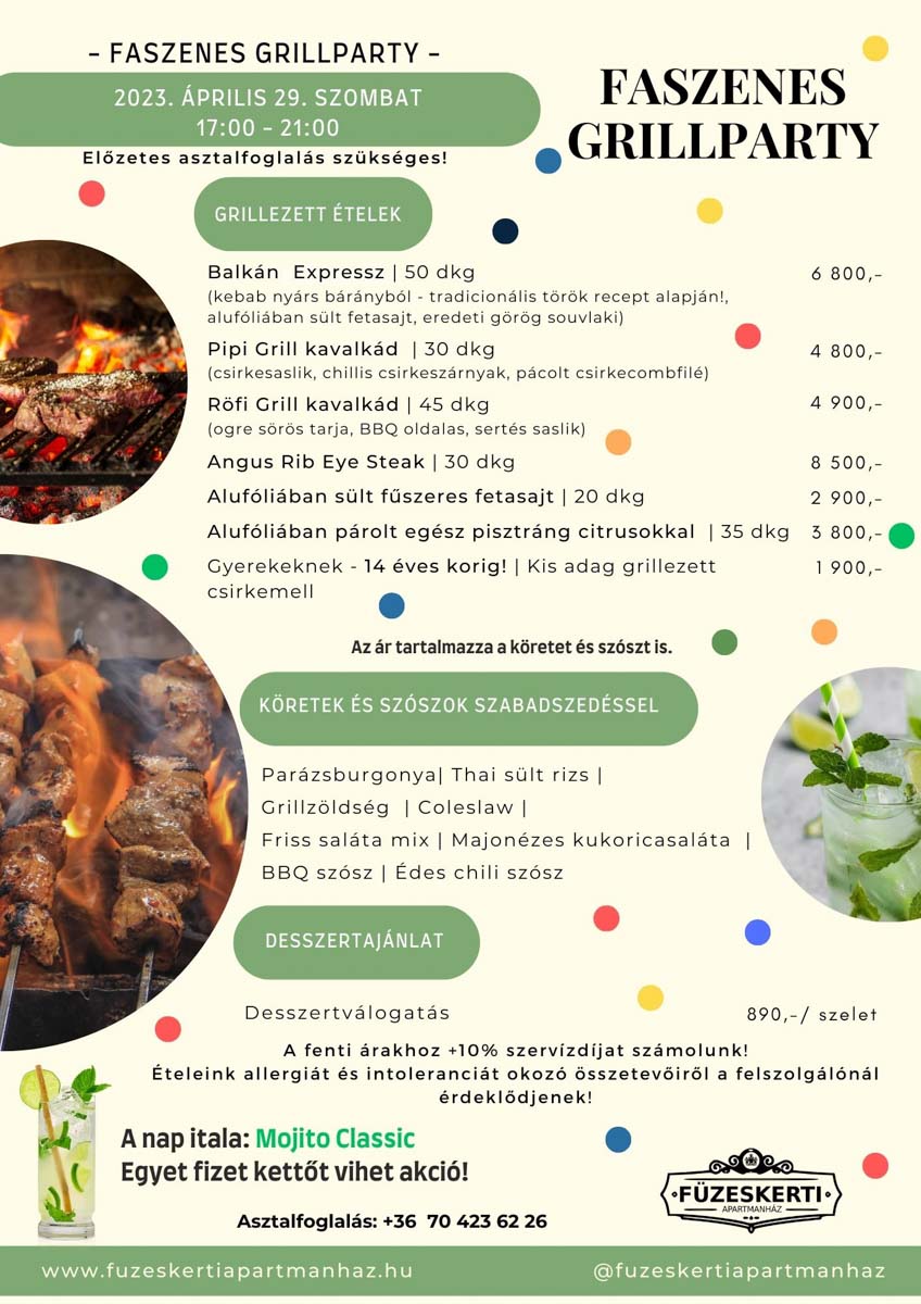 Faszenes grillpartyszo29ápr17:00szo21:0017:00 - 21:00 Füzeskerti ÉtteremCompleted