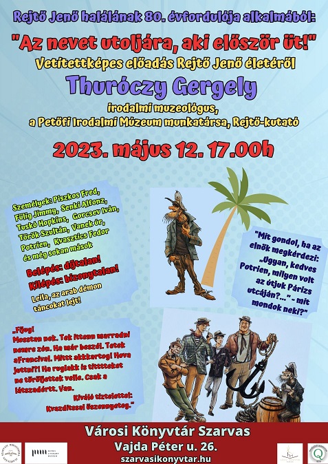 2023. május 12. 17 óra: “Az nevet utoljára, aki először üt.” – vetítettképes előadás Rejtő Jenő életéről – Thuróczy Gergely, a Petőfi Irodalmi Múzeum munkatársa,