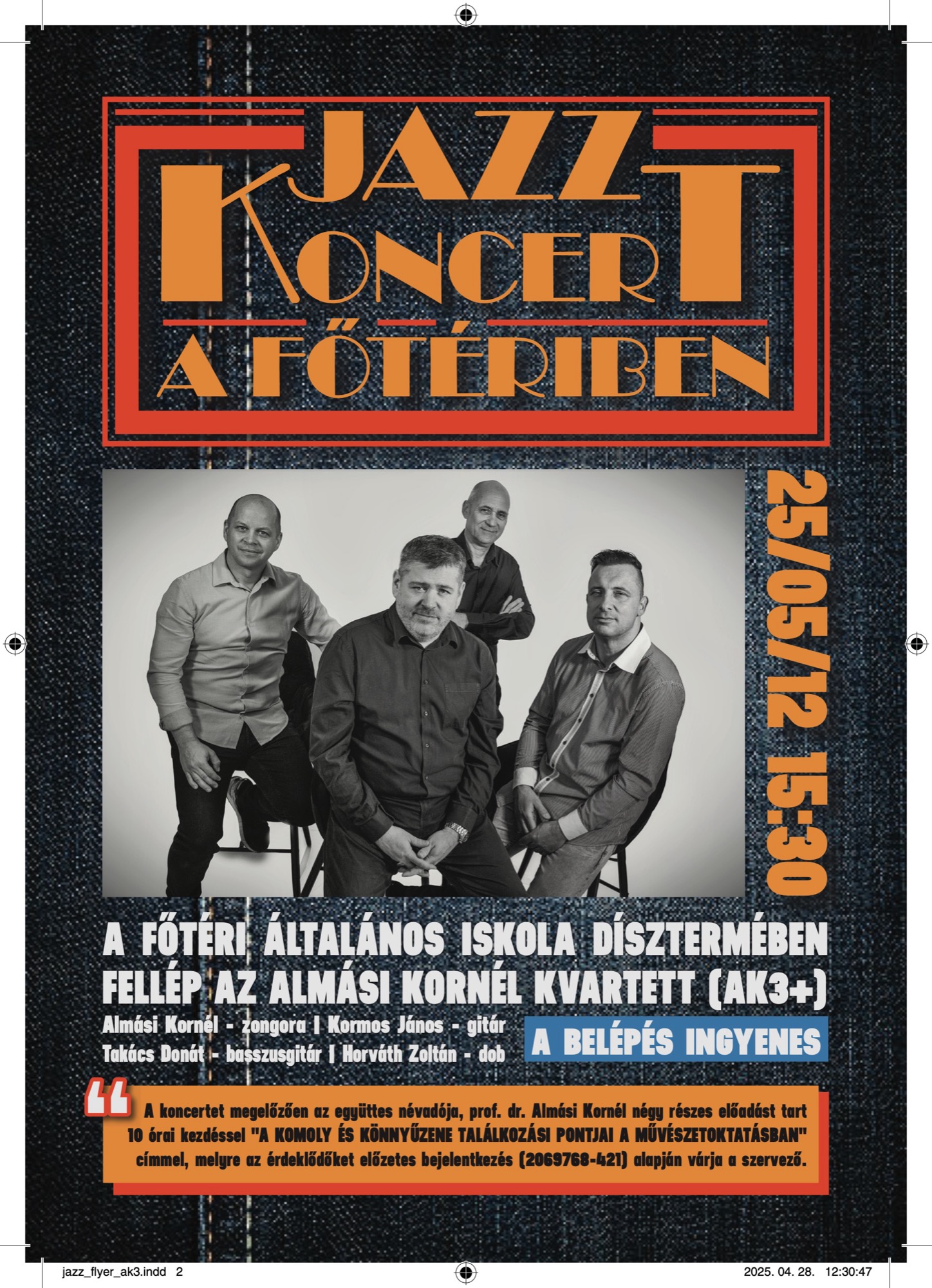Jazzkoncert a Főtériben12máj15:3015:30 Fő téri Általános IskolaCompleted