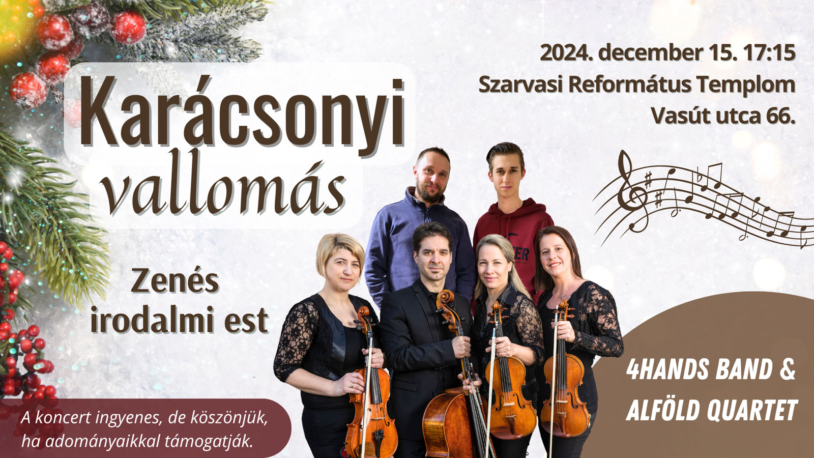 Karácsonyi vallomás 4Hands Band & Alföld Quartetvas15dec17:1517:15 Református templom, Szarvas, Vasút utca 66.Completed
