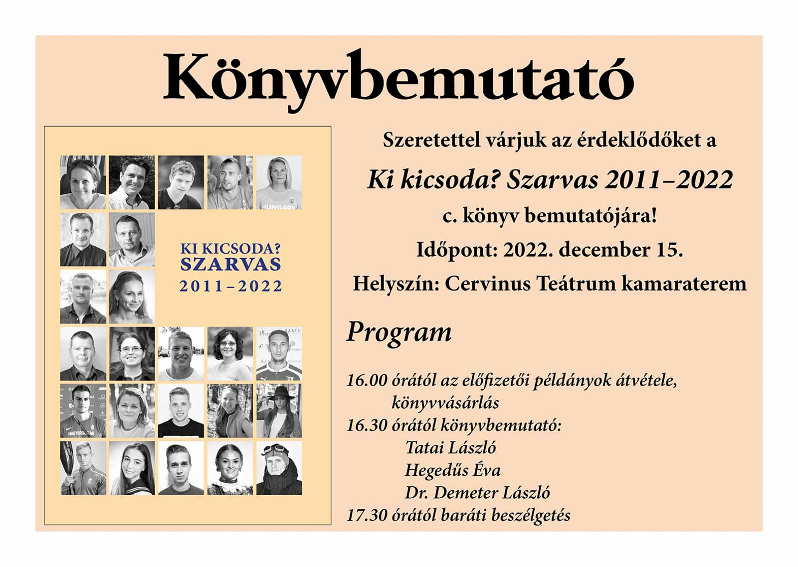 Ki kicsoda 2011-2022 – könyvbemutatócsüt15dec16:3016:30 Cervinus Teátrum, Kossuth tér 3.Completed
