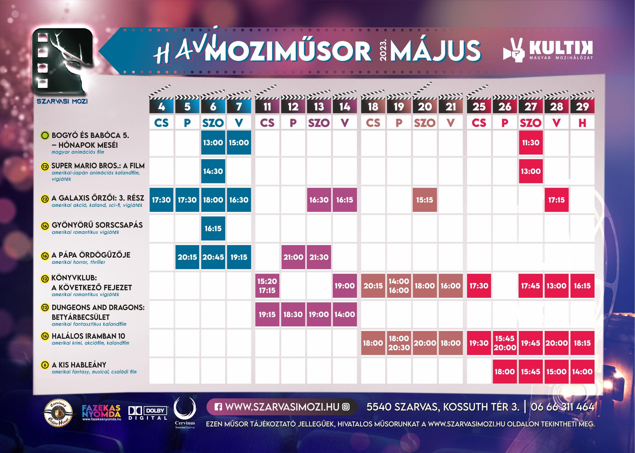 Májusi moziműsorcsüt04máj(máj 4)17:30hé29(máj 29)18:1517:30 - 18:15 (29) Szarvasi Mozi, Kossuth tér 3.Completed
