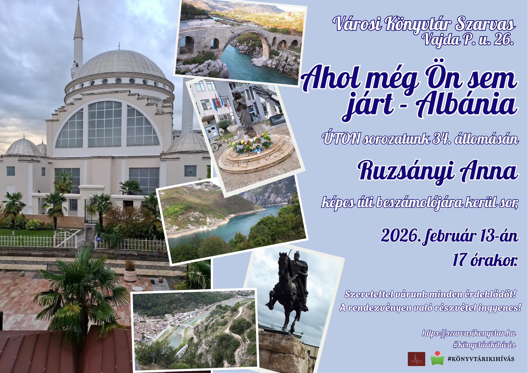 Ruzsányi Anna képes úti beszámolója Albániárólpént13feb17:0017:00 Városi Könyvtár, Vajda Péter u. 26.