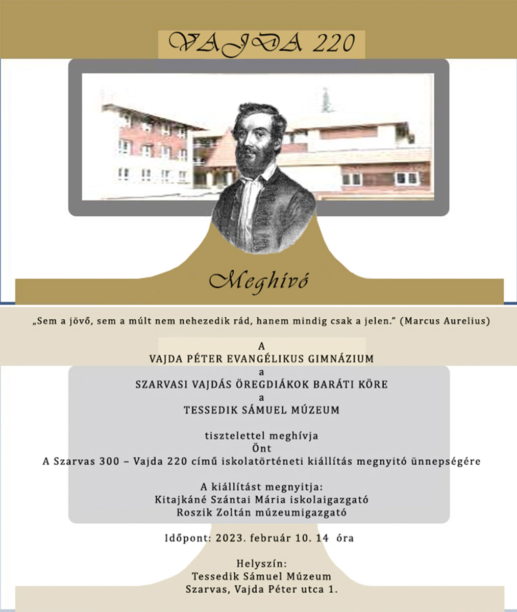 Szarvas 300 - Vajda 220 iskolatörténeti kiállításpént10feb14:0014:00 Tessedik Sámuel Múzeum, Vajda Péter u. 1.Completed