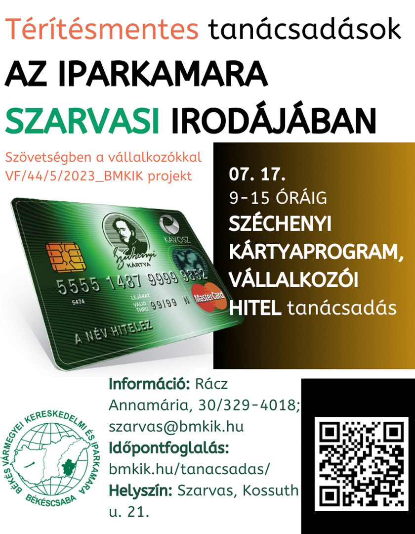 Tanácsadás a Széchenyi kártyaprogramról és a vállalkozói hitelekrőlsze17júl09:00sze17:0009:00 - 17:00 Békés Vármegyei Kereskedelmi és Iparkamara szarvasi irodája, Szarvas, Kossuth u. 21.Completed