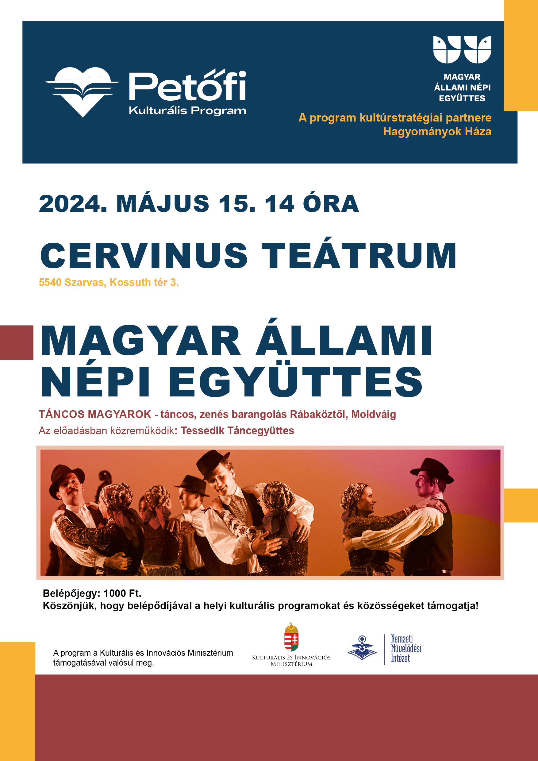 Táncos, zenés barangolás a Magyar Állami Népi Együttesselsze15máj14:0014:00 Cervinus Teátrum, Kossuth tér 3.Completed