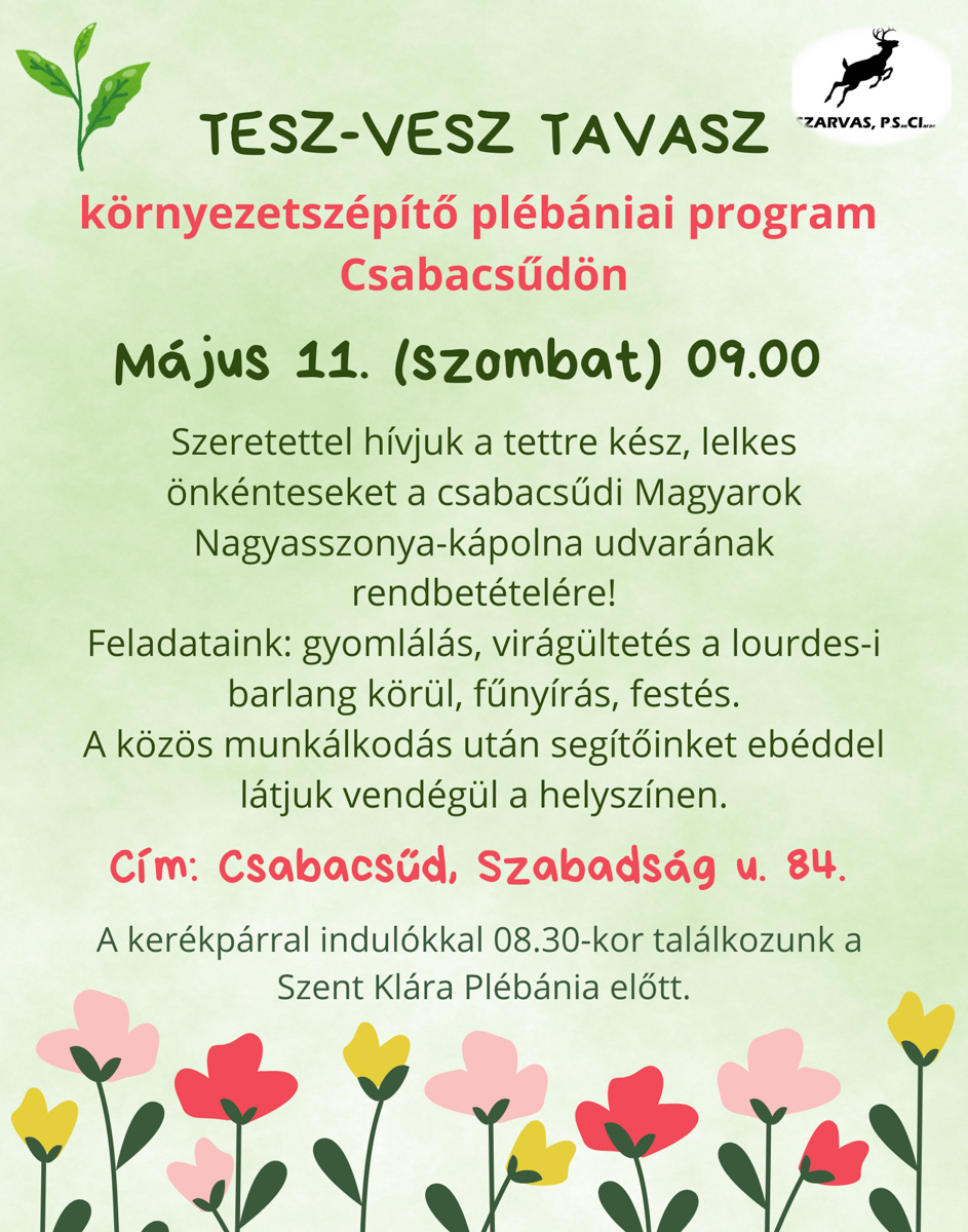 Tesz-vesz tavaszszo11máj09:0009:00 Magyarok Nagyasszonya kápolna, Csabacsűd, Szabadság u. 84.Completed