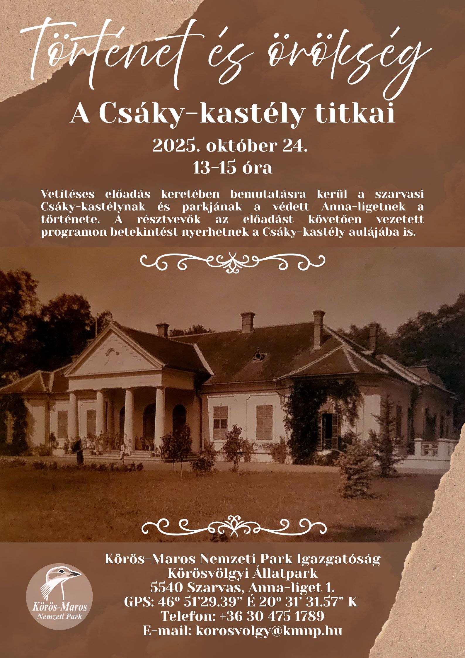 A Körös-Maros Nemzeti Park Igazgatóság Körösvölgyi Állatpark bemutatóhelye 2025. október 24.-én, szeretettel várja az érdeklődőket egy különleges őszi programra, mely során a szarvasi Anna-liget rejtett múltjába nyerhetnek betekintést. A “Történet és örökség – A Csáky-kastély titkai” című esemény izgalmas időutazásra hívja a látogatókat.